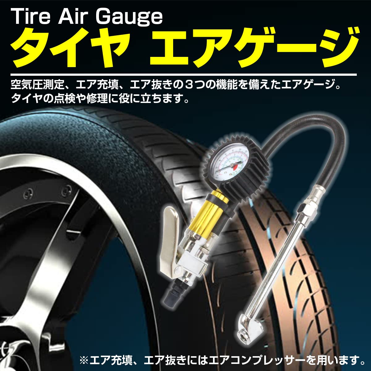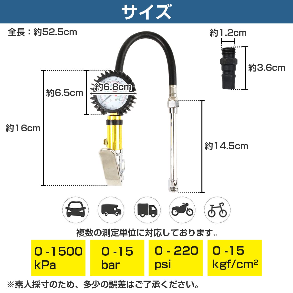 タイヤのエアチェックに 3ファンクションタイヤゲージ。<br> 車、バイク、自転車等に幅広く使えます。<br> これ一つで空気圧測定、エア充填、エア抜きが思いのまま!<br> タイヤの点検や修理に役立ちます。<br> <br> 縦方向に取り付けられた加圧レバーで圧力計を正面に見ながら加圧でき、減圧調整ボタンで細かく空気圧を調節することができます。<br> ストレートタイプの棒チャックで狭い場所でも使いやすい形状です。<br> また、ヘッド部は両口タイプで、場所に合わせて使う口を選べます。<br> <br> 空気圧チェックはチャックをバルブに押し当てるだけで測定。<br> エア充填・エア抜きには別途エアコンプレッサーを接続してください。<br> <br> とても見やすい大型ゲージ付き!<br> 複数の空気圧単位に対応しています。<br> <br> サイズ:全長約52.5cm(詳細は画像をご確認ください。)<br> 接続方式:1/4カプラー<br> 測定範囲:0-1500kPa、0-15bar、0-220psi、0-15kgf/cm2<br>重量:約380g<br> <br> 当商品は海外製品のため、多少の傷、汚れなどがある場合がございます。<br> ご使用に問題はございませんので、ご了承の上、お買い求め下さい。<br> <br> 保証について:<br> Amazon.co.jpとほぼ同等の返品・交換の条件を設定しております。<br> 商品が到着後、<b>30日以内</b>に<b>返品申請</b>と<b>弊社指定業者での返送</b>をお願い致します。<br> 返品のお手続きは【注文履歴】で承っています。【商品を返品または交換する】をご選択ください。<br> なお、お客様都合でのご返品の場合、送料はお客様負担となりますのでご了承ください。<br> 詳細は【ストアトップページのヘルプ】よりご確認ください。<br> ストアトップページはこちら<br> https://www.amazon.co.jp/sp?_encoding=UTF8&asin=B08WRVXT6R&isAmazonFulfilled=0&ref_=olp_merch_name_1&seller=A9PF3ONJV0X4
