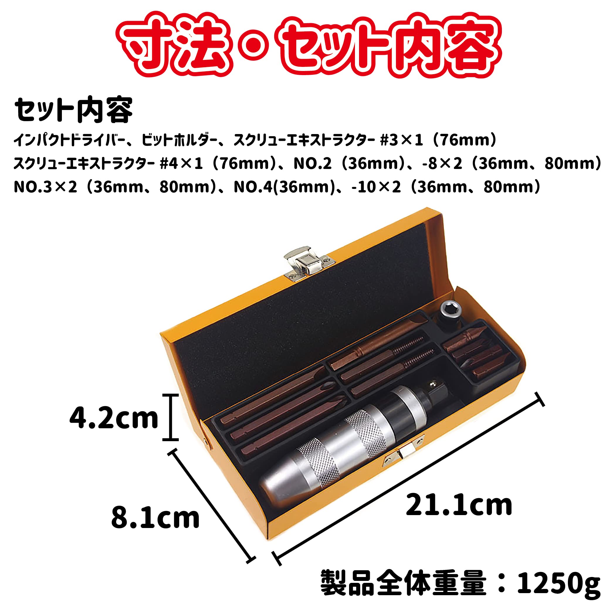 【パッケージ内容】インパクトドライバー、ビットホルダー、NO.2(36mm)、NO.3×2(36mm、80mm)、NO.4(36mm)-8×2(36mm、80mm)、-10×2(36mm、80mm)、スクリューエキストラクター#3×1(76mm)、スクリューエキストラクター#4×1(76mm)