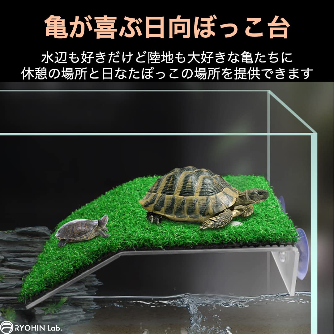 【高品質な人工芝を採用】日なたぼっこ台の表面に綺麗でナチュラルな人工芝が備わっています。亀の水槽をよりナチュラルに彩ってくれてとてもオシャレです。足がかりが良いため亀にとっても滑りにくく、登りやすいスロープ仕様です。※初めは芝が落ちやすい場合がありますので、余分な芝をよく払ってからのご使用をおすすめします。