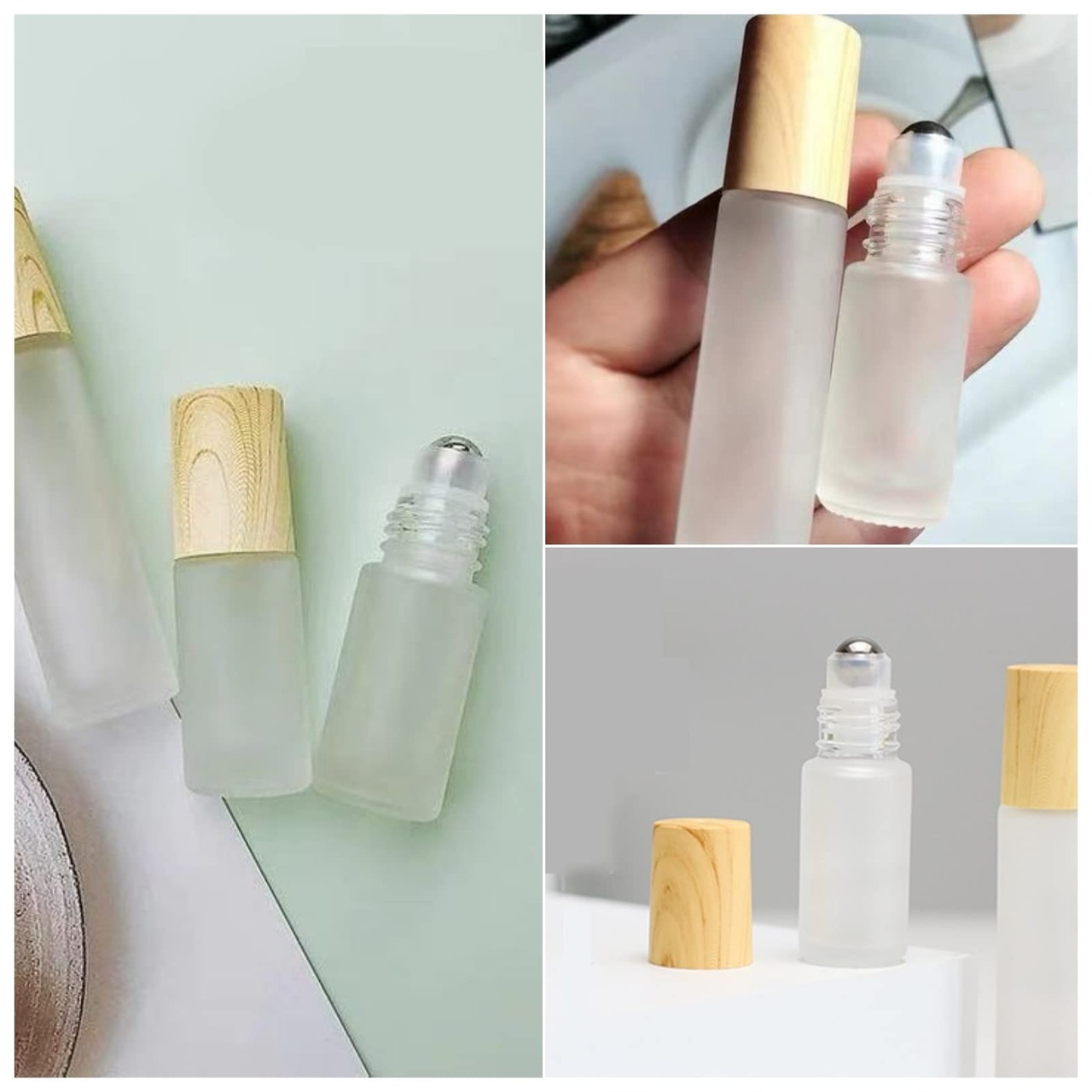 ロールオンタイプのガラス瓶10本セットです。<br>香水やアロマオイル、エッセンシャルオイル、虫よけ精油などの持ち運びに便利な手のひらサイズのガラスボトルです。<br><br>植物油の精油を使ってオリジナルのロールオンフレグランス作りにもおすすめ。<br>お気に入りの香りの詰め替え容器としても。<br><br>化粧ポーチにもコンパクトに収納できるミニサイズ。<br>出張・旅行用のアロマ保存容器、小分け用に便利です。持ち歩きにもおしゃれなかわいい木目の蓋つき。<br><br>先端はローラータイプで量を調節しやすく、少しだけ付けたい方にもおすすです。ローラー部はステンレス製。スプレータイプとは違いフレグランスが飛び散らずに外出先でも安心です。<br><br><br>耐久性に優れたガラス製です。<br>本体カラーは光を柔らかく通す、つや消しのすりガラスです。<br><br>容量:5ml カラー:乳白色 蓋素材:プラスチック 本体素材:ガラス(半透明)<br><br>※高濃度のアロマオイルやアルコール、香水以外のものを入れないようご注意下さい。<br><br>容量10mlタイプも販売しております。是非ご覧ください。<br><br><br>5ml:直径19mm 高さ65mm