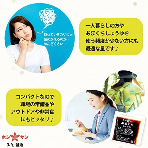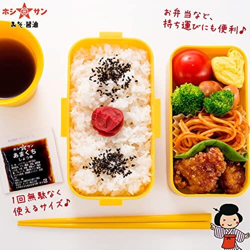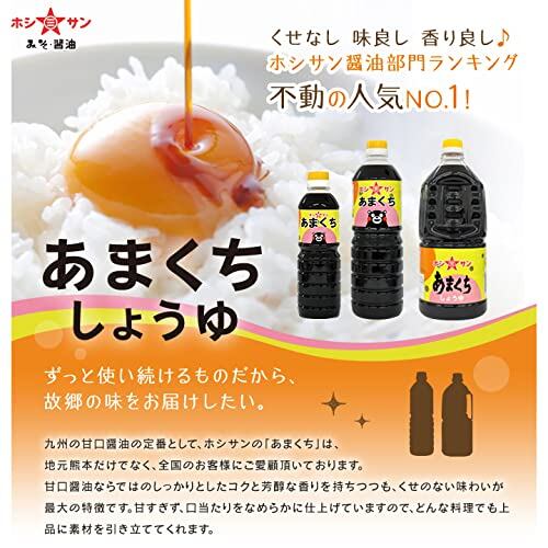 九州くまもとの老舗醤油屋ホシサンの人気No.1「九州醤油 あまくち」の小袋タイプになります。甘口醤油ならではのしっかりとしたコクと芳醇な香りを持ちつつも、くせのない味わいが最大の特徴です。甘すぎず、口当たりをなめらかに仕上げていますので、どんな料理でも上品に素材を引き立ててくれます。まさにオールマイティーな万能醤油です。 また、今だけお得なセット!ホシサンの高級さしみ醤油「甘露」を、限定で小袋タイプにして10個付いてきます。二度の醸造を経て完成する「再仕込み醤油」を贅沢に使用し、九州さしみ醤油の特徴であるとろっとした“とろみ”をもち、濃厚なコクと香りをお楽しみ頂けます。辛いわさびとの相性も抜群です。