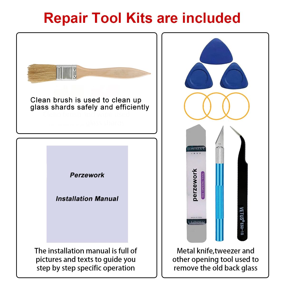【フルセットツールキット付き】フルセットのプロフェッショナル修理ツールキットが付属しています。 壊れたバックガラスを取り外すのははるかに簡単です。元の接着剤は非常に強いため、接着剤を加熱して古いガラスを取り外すには、長いヒートガンまたはヘアドライヤーを用意する必要があることに注意してください。