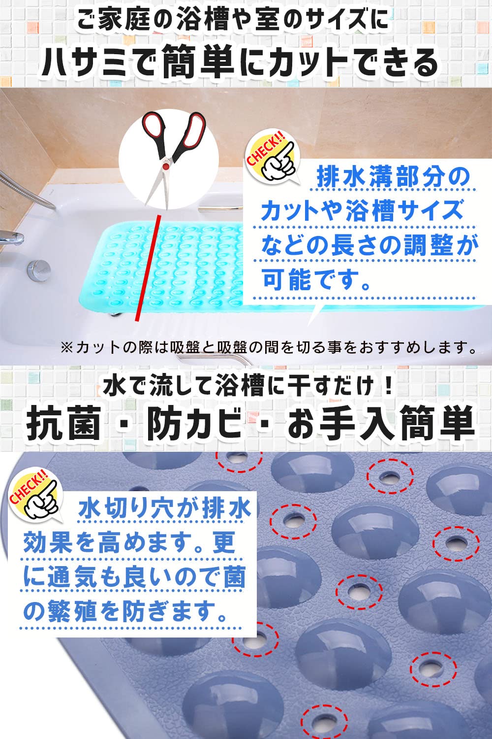 ◆【フリーカット】サイズ:39×79cm 167個の吸盤がしっかり吸着しズレません。 ご使用の際は裏面の吸盤をしっかり浴槽の底面に吸着させてご使用ください。はさみやカッターで切ることができますのでサイズや形状を簡単に加工できます。