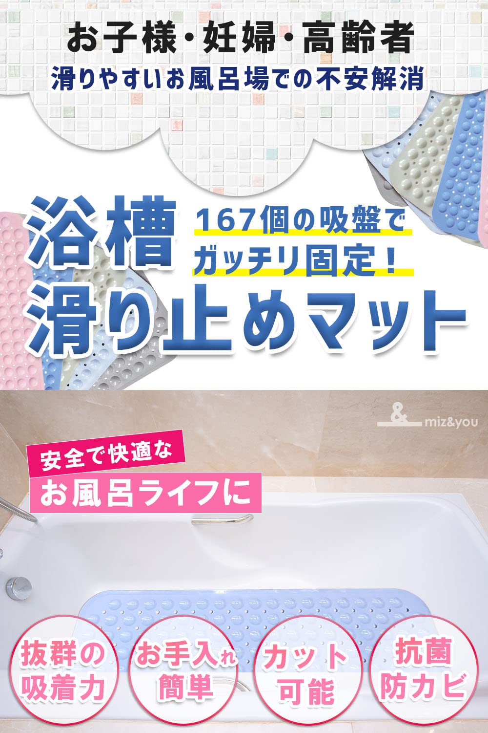 ◆【快適なお風呂ライフ】滑り止めマットはお子様や妊婦さん、お年寄りや赤ちゃんを抱いたパパさんの滑りやすいお風呂場での不安解消におすすめ。miz&you浴槽お風呂マット