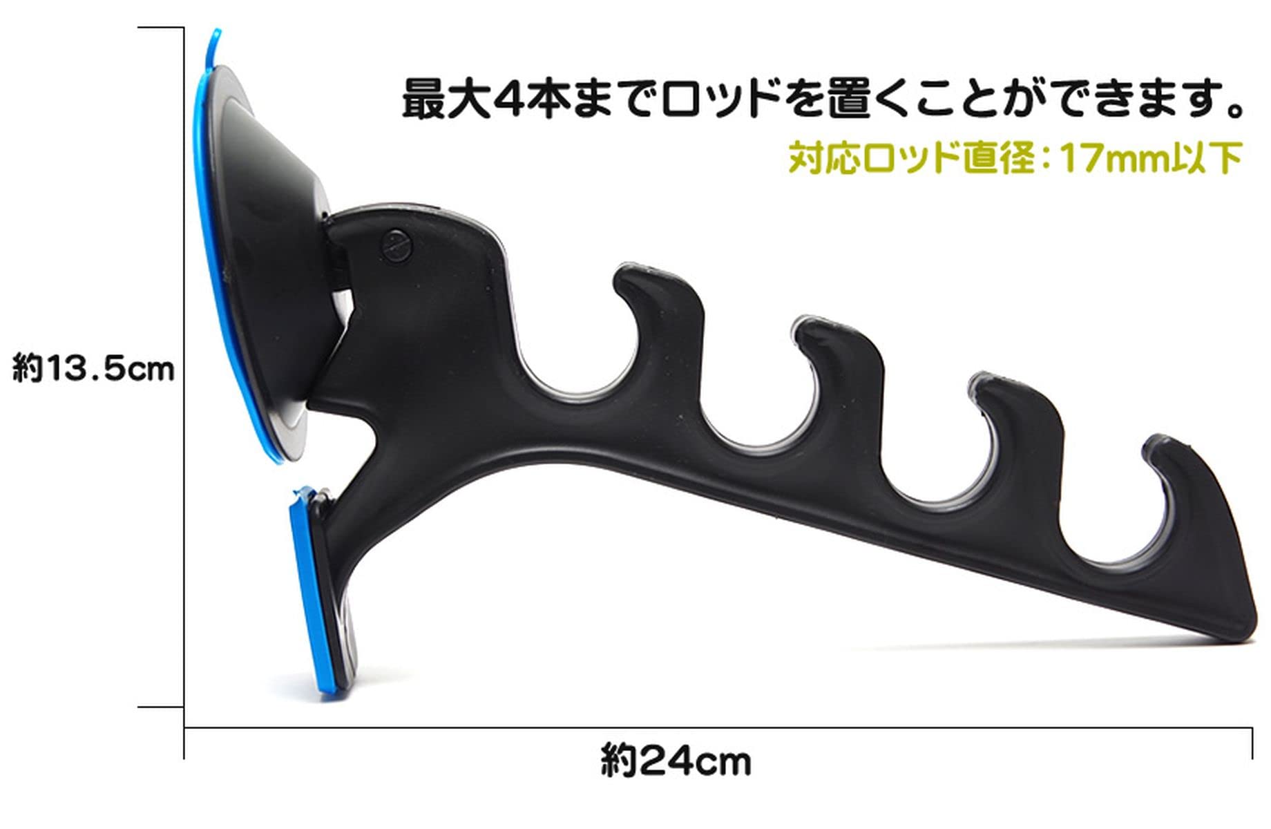 吸盤式の4連マルチハンガー<br>車の窓面やクーラーボックスに<br>設置してロッドを置いておけます。<br><br>吸盤を設置面にくっつけてフック部分を起こすだけ、<br>使いたい時にサッと設置することができます。<br><br>最大4本までロッドを置くことができます。<br><br>サイズ:約24×13.5cm<br>対応ロッド直径:17mm以下<br>耐荷重:約5kg<br>重量(1個あたり):約106g<br>材質:ABS樹脂<br>生産国:中国<br><br>※設置は平らで凹凸のない面に取り付けてください。<br>※薄いガラス面などには取り付けないでください。<br>※輸入商品のため、予告なくデザインが変更される場合がございます。<br>※輸入商品のため、サイズが若干異なる場合がございます。<br>※輸入商品のため、商品に若干の傷や汚れがある場合がございます。<br>※商品の使用により生じた如何なる損害・被害も、<br> 弊社では一切の責任を負いかねますので予めご了承下さい。
