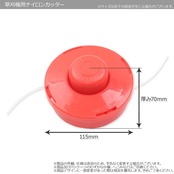 金属刃では刈ることができない塀の近くや柔らかい草等に使用できるナイロンカッター!<br>中央部分を押して引っ張れば短くなったコードが繰り出せます。<br>また、回転中に底面のボタンを軽く叩くように押さえてもコードが出せます。<br>シーンに合わせての使い分けにおススメです!<br><br>サイズ:約φ115×厚み70mm<br>適合ネジサイズ:M10×P1.25mm<br>ナイロンコード長:約1.5m(コード最長:約70cm×2穴)<br>重量:約160g<br><br>※仕様・デザインは改良のため予告なく変更する事がございます。<br><br>※基本送料は無料です。但し、北海道300円(税別)、沖縄・離島・一部特定地域は500円(税別)を別途頂きます。<br>※佐川急便での発送となります。(お客様にて運送会社をお選び頂く事は出来ません。)<br>※発送は即日から3営業日以内となります。(お支払い方法、ご購入のタイミング、在庫状況により異なります。)<br>※複数の店舗で在庫を共有しておりますのでご注文のタイミングによってはやむを得ず在庫切れとなってしまう事がございます。<br>予めご了承の上でご注文頂きますようお願い申し上げます。