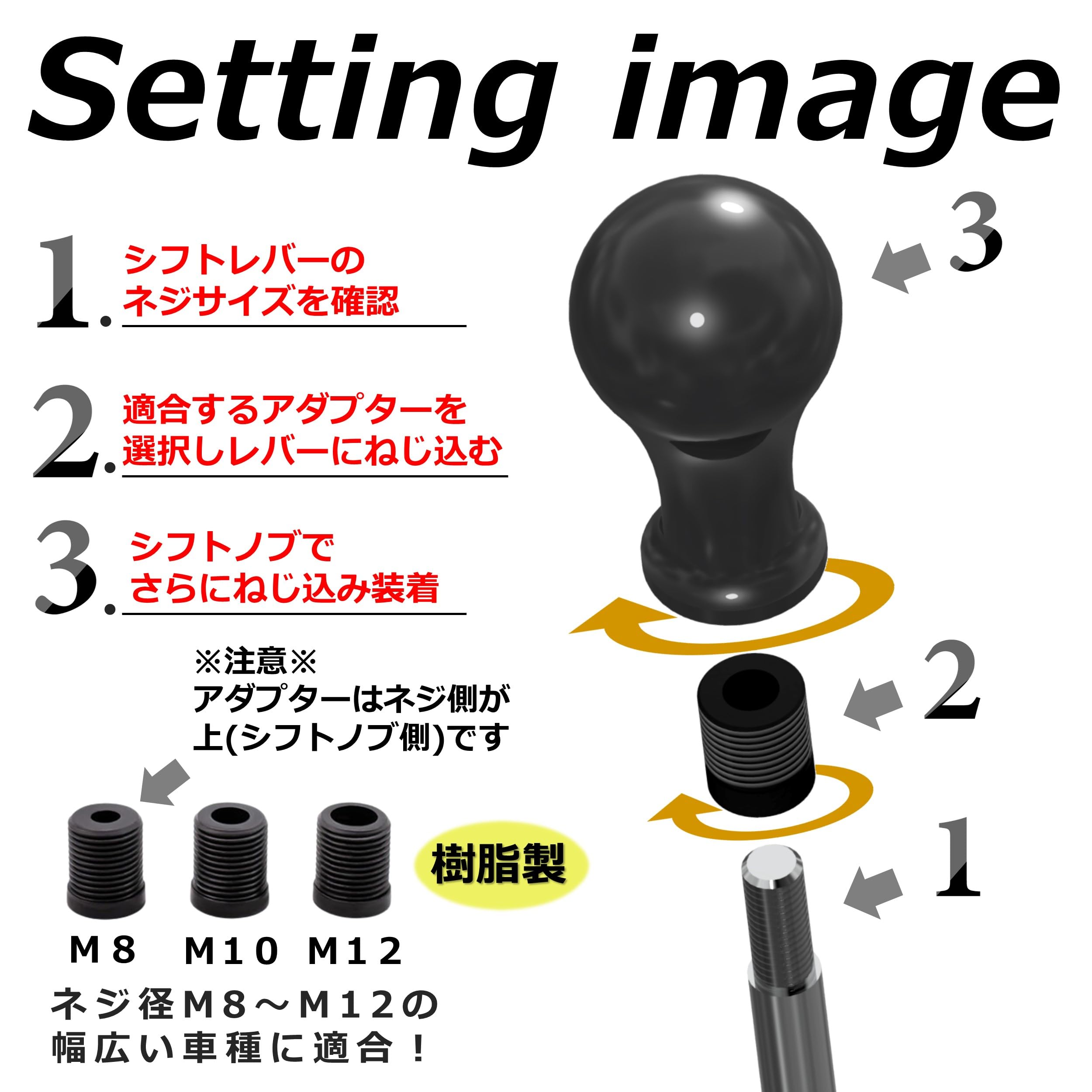 球体部の径44mm、全長80mm。軽快なシフトチェンジを楽しめるやや短めのセミショートシフトノブです。手で包み込むように上から握れる丸形、ボール型シフトノブと横からアクセスに向いているスティック型シフトノブの中間形状をしているため、上からも横からもハンドリングしやすいのが特徴です。たる型シフトノブとも呼ばれます。本体はアルミ製140gでほどよい重量感、M8、M10、M12アダプター付属で幅広い車種適合の汎用タイプです。カラーはチタン調、シルバー、ブラックの3色ラインナップです。商品写真は撮影時の場所、照明などの環境、またPC、携帯等のモニター環境により実際の色味と若干差があるように見える場合がございます。予めご了承ください。説明書の付属はございません。取付け、車検適応等のサポートは行っておりません。破損、事故防止のため専門業者へのご依頼をお願いいたします。