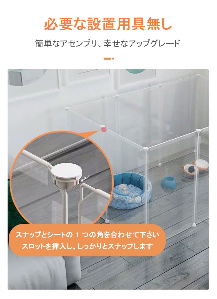 <p> ✔ </p> <p> ※設置するお部屋や用途に合わせてお好みの形にジョイントできるペットサークルです。 <p> ✔ </p> <p> ※正方形、長方形、L字型等、お好みの形にレイアウトできます。 <p> ✔ </p> <p> ※テレビやAV機器の保護、玄関や階段への出入り防止、棚や仕切りなど様々な用途でご使用できます。 汚れたり水がこぼれてしまっても簡単に拭き取ることができます。 中からも外からも周りの様子が見えるのでペットも飼い主様も安心です。 <p> ✔ </p> <p> ※ペットが出入りしやすいドア付きのパネルが1枚付属されています。 <p> ✔ </p> <p> ※また、ドアが外側に開く向きで取り付けてください。 <p> ✔ </p> <p> ※プラスチック製で汚れても丸洗いできる 汚れやニオイが気になったら手軽に丸洗いできる、錆びつく心配のないプラスチック製のケージです。 <p> ✔ </p> <p> ※「パネル」を組み合せて構成されているから組み替え、拡張、リペア、が簡単にできます。 組み換え-- 扉、パネルの位置を変える、細長の構成にする等、ペットフェンス 内でのパネル毎の組み換え、配置がパネル構成の範囲内で可能です。 拡張-- 成長したので、1頭増えたので、ペットフェンス広くしたい場合、別売のパネルを追加すれば拡張が簡単に可能です。 リペア--汚損・損耗した場合、丸ごとではなくパネルごとに入れ替えることが出来るので永続的な使用が出来ます。 <p> ✔ </p> <p> ※商品仕様:11枚 x 透明なPPパネル(幅35 × 高45㎝) パネルサイズ:45×35cm(1枚) 1枚 x 金属網状ドアパネル(幅35 × 高45㎝) 24個 x ジョイントコネクター バックル 40本 x 結束バンド 1本 x 木槌