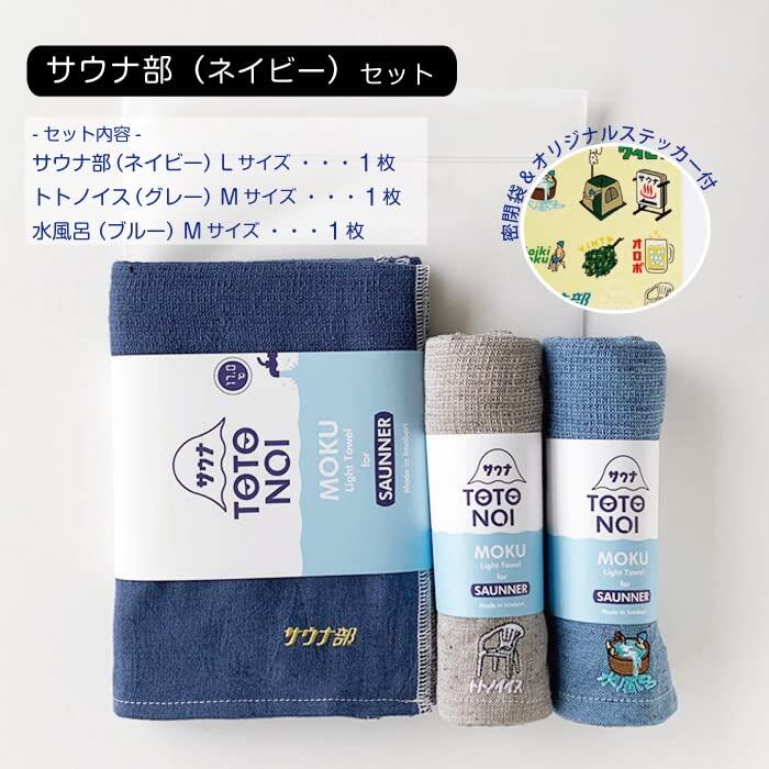 ◎超軽量・速乾!Lサイズ1枚&Mサイズ2本セット 密閉袋とステッカー付! ①サウナ部(ネイビー)セット サウナ部(ネイビー)Lサイズ・・・1枚 トトノイス(グレー) Mサイズ・・・1枚 水風呂(ブルー)Mサイズ・・・1枚 ②サウナ部(ベビーピンク)セット サウナ部(ベビーピンク)Lサイズ・・・1枚 熱波(マンダリン) Mサイズ・・・1枚 オロポ (アクア) Mサイズ・・・1枚 ③水風呂(ブルー)セット 水風呂(ブルー)Lサイズ・・・1枚 レトロサウナ看板(イエロー) Mサイズ・・・1枚 熱波(マンダリン) Mサイズ・・・1枚 ◎薄くてもしっかり吸水!そのヒミツは? ガーゼ&パイル構造なのでたっぷり吸水! さらに、吸水だけでなく「分厚いタオルだと絞り切れなくて…」という方もギュギュっと絞りやすいちょうどいい薄さのタオルです。 ◎バスタオルとして使えるLサイズは 100gと超軽量! 畳むと超コンパクト。収納時にかさばらず、洗濯物のボリュームダウンが叶います。サイズは、一般的なバスタオルと同じ60×120㎝。体にグルっと巻きつけてお使いいただけます。 ◎Mサイズは首かけにベストな33×100cm 手ぬぐいの長さに近い100cmに設定されています。 この20㎝が思いのほか便利なものです。腰に巻いたり、外気浴の際にカラダに掛けたり便利な使い方ができます。 サラッとしたガーゼ面の肌触りは火照った湯上がりの素肌にも快適!通気性がいいので、常に清潔に保てるのも嬉しいポイントです。 ◎今治から心を込めてお届けします 厳選された素材と、日本の優れた感性と技を活かし、今治の自社工場で丁寧に心を込めて製造しています。 【お手入れ方法】 ●多少の色落ち、毛羽立ちがありますので他のものとは別に洗ってください。 ●タオルの風合いと吸水性を損ねる原因となりますので、柔軟剤は極力使用しないでください。 ●ドライクリーニング、漂白剤は使用しないでください。 ●生産国:日本製(今治) ●サイズ:Mサイズ(フェイスタオル) 33×100cm Lサイズ(バスタオル) 60×120cm ●素材:綿100% ※お使いのモニター設定、お部屋の照明等により実際の商品と色味が異なる場合がございます。