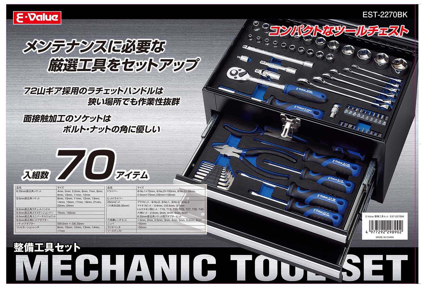イーバリュー(E-Value) 整備工具セット ツール70点+ツールチェスト ブラック EVAマットトレー仕様 各種メンテナンス対応 バイク 自動車 DIY 日曜大工向け EST-2270BK