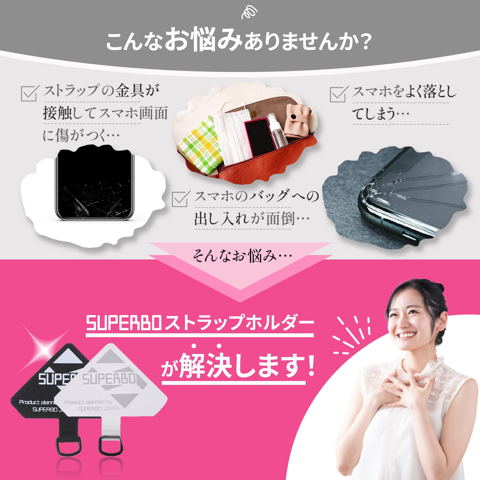 ☆ 【快適さと使い勝手を考えたストレスフリー設計】SUPERBOのスマホホルダーは耐久性とデザイン性を追求しました!日本人の企画するブランドですので安心してご使用いただけます。 ☆ 【シンプルかつ計算された性能】お手持ちのスマホケースと携帯電話に挟み込むだけですのでほとんどの形状のケースにご使用いただけます、充電時にできるだけ邪魔にならないようかつ耐久性もある絶妙な厚みになっております。 ☆ 【優秀な素材】(黒)TPU 素材でできた非常に柔軟性のある素材で作りました! TPU素材は柔軟かつ丈夫です、またクリア(透明)ですのでクリアタイプのケースをご使用の場合でも 極力目立たないのも注目すべきポイントです! ☆ 【商品サイズ】アタッチメント 厚み 0.6mm 幅60mm 高さ 32mm (※重要事項) ご使用の携帯ケースの横幅をご確認ください!国内メーカーの殆どの商品にご使用いただけるよう設計しておりますが、商品の中にはケースがご使用出来ないもの、アタッチメントよりも幅が小さい製品におきましてはご使用になれません。 ☆ 【充実の日本人サポート】SUPERBOは日本人が企画しているブランドです!日本人基準の検品をしております! 万が一初期不良がございましたら60日間の返品返金保証をおつけしております。お問い合わせ対応も日本人が迅速かつ丁寧に行いますのでご安心ください。