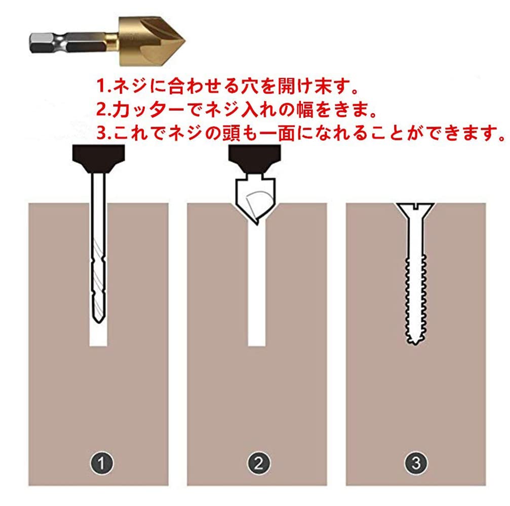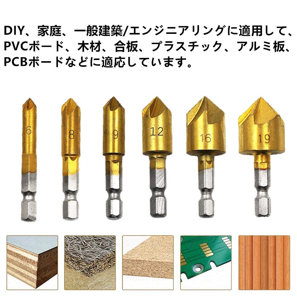 皿取り錐ドリル ビット 6~19mm HSS鋼 六角軸 穴あけ工具 下穴錐 座ぐり 面取りカッター チタンコーティング 電動ドリルセット (6本セット)