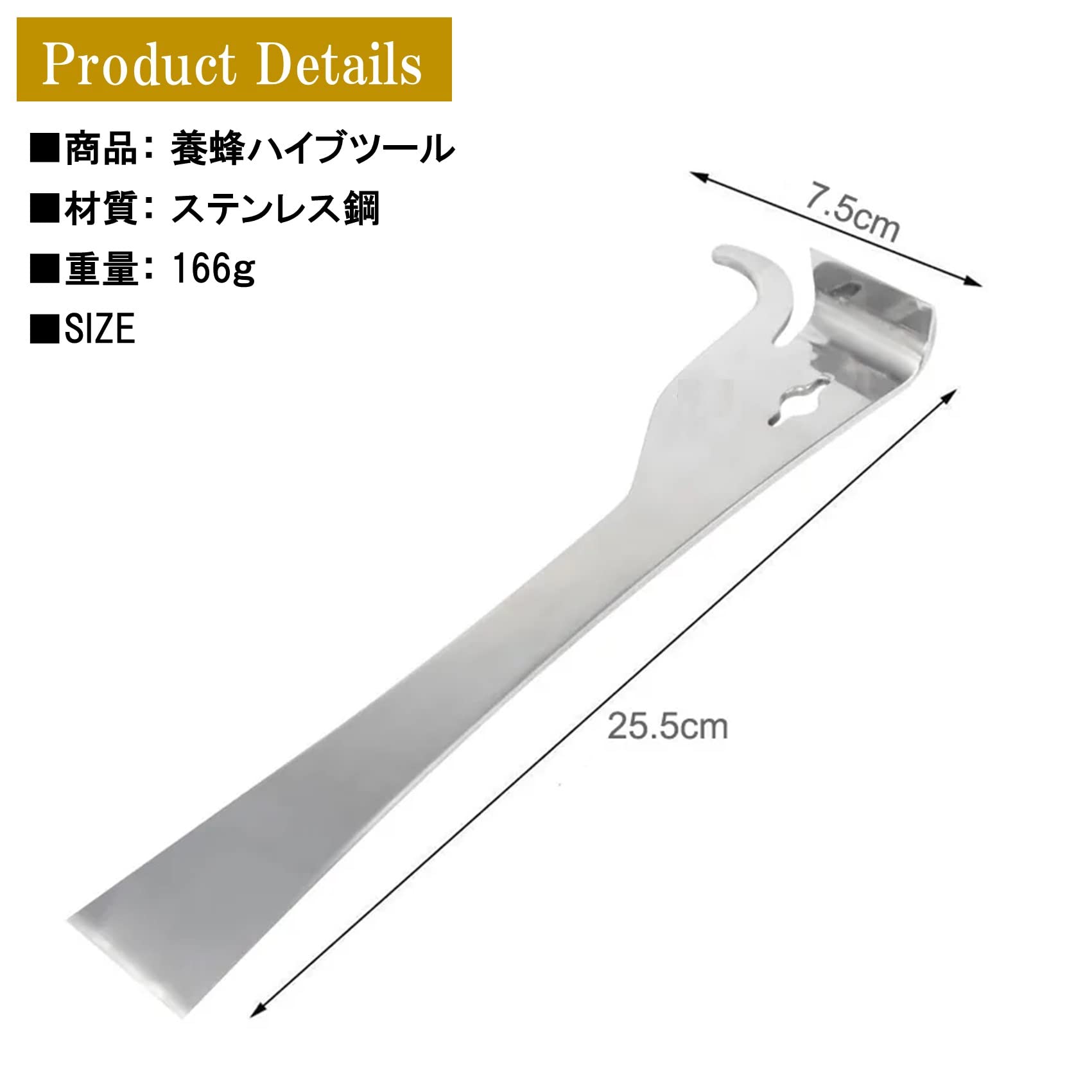 商品詳細: 養蜂ハイブツール 【サイズ】 25.5×7.5cm 【重量】 約166g 【材質】 ステンレス鋼 ※モニターの環境等により、色の見え方に若干差が生じる場合がございます。予めご了承ください。