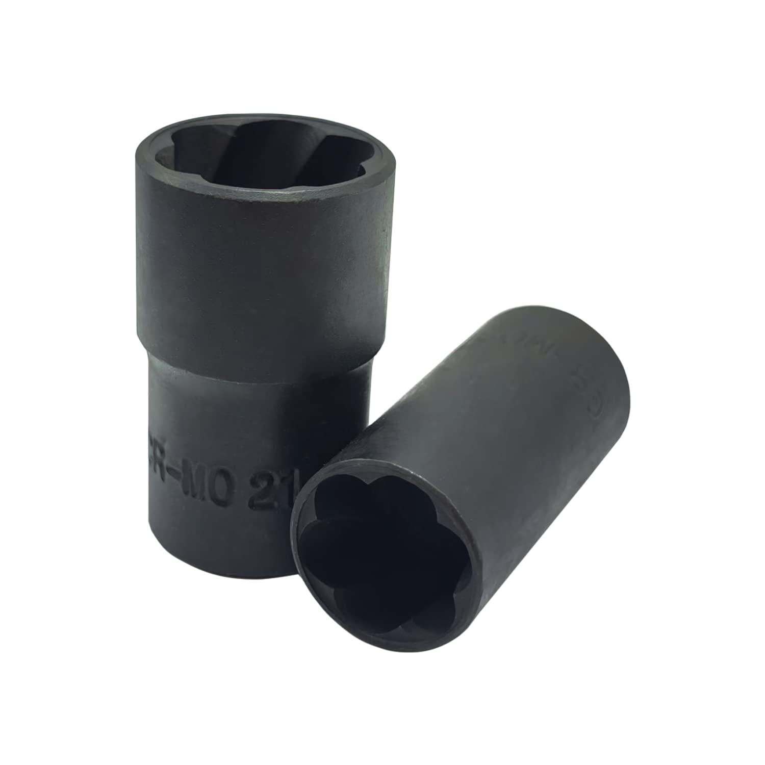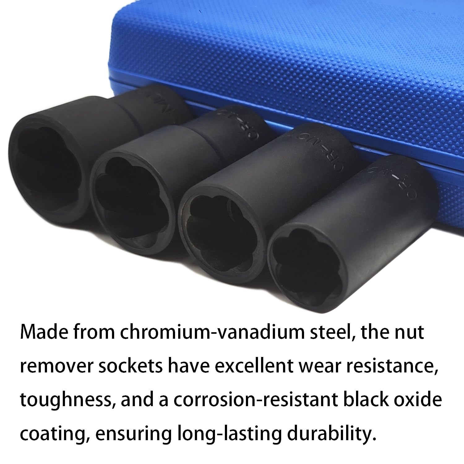 JUECLEL ツイストラグナットソケットセット 5個 - 1/2インチドライブ損傷ナットロックリムーバーエクストラクター - 錆びて頑固なロックナット取り外しツールキット メートル法17mm 19mm 21mm 22mmソケット&センターパンチバー付き