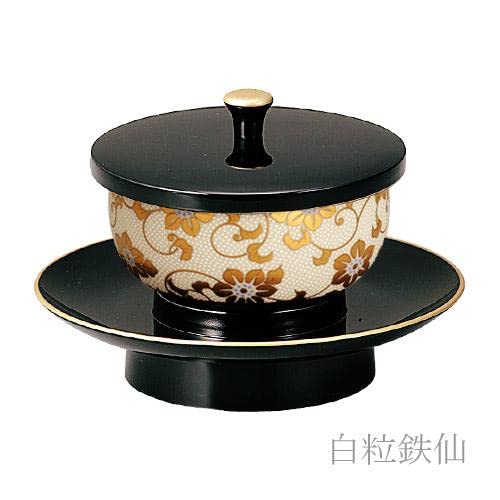 茶菓接待に・一名分のおもてなしセット お寺様が読経に来られた際など、机のない部屋でお茶をお出しする際に便利な茶菓用セットです。お盆はノンスリップ加工がしてありますので持ち運びの時に滑りにくくなっています。供物台も台が太めで安定感があります。細かく描かれた粒に金で描かれた鉄仙が映える絵柄です。九谷焼の伝統柄の中でもきらびやかで人気があります。