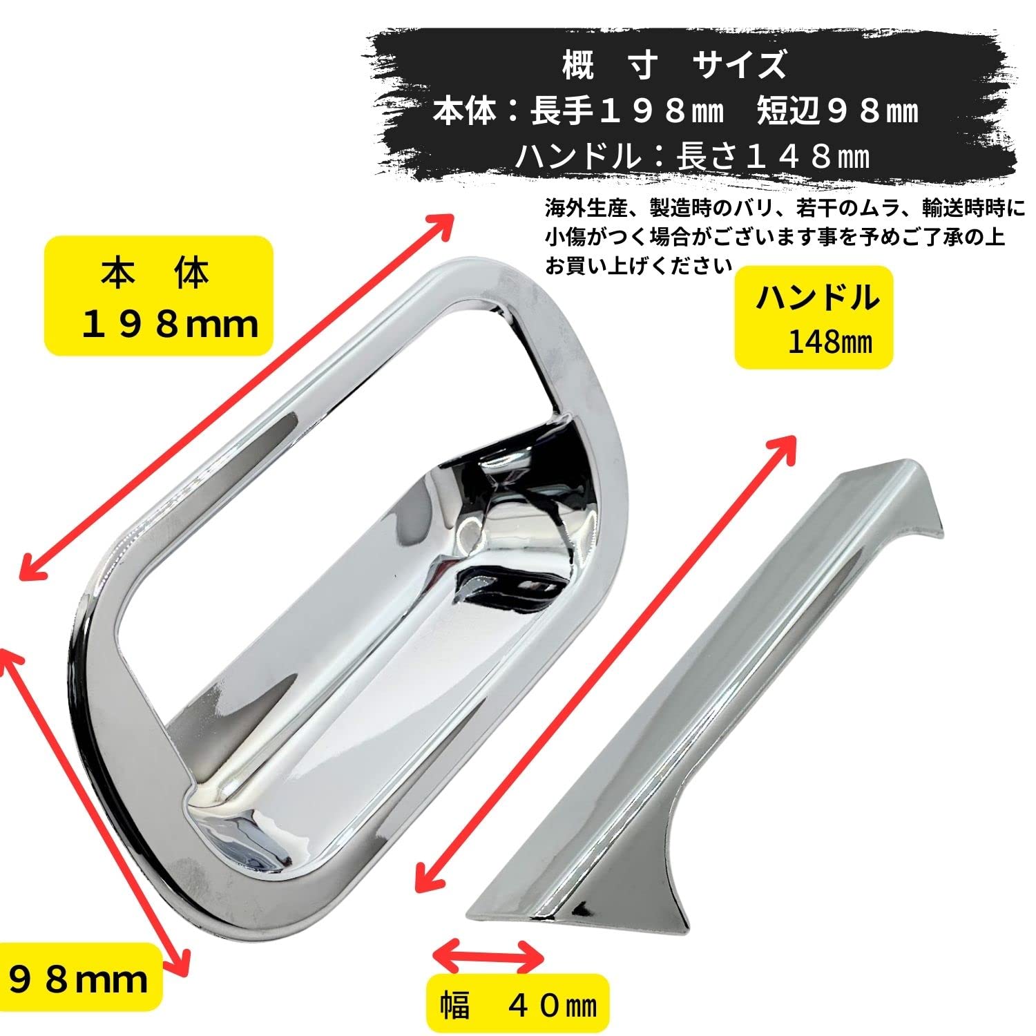 ドアハンドルカバーは光沢クロームメッキ仕上げにより、愛車のサイドビューをキレイにドレスアップ。ドアグリップカバーは他のドレスアップパーツとの相性も良く。裏面の両面テープにより簡単に貼り付ける事で取り付け可能です。【適合車種参考】メッキ仕上げのドアカバーは三菱ふそう NEWキャンター(1993・H5年11月~2002・H14年6月)に取付用の左右セットとなります。取付け前に、仮合わせを行ってください、グラツキや隙間、ハンドルの劣化が激しい場合、粘着が弱くなる場合は、強力な両面テープ等で補強してください。海外製造品になりますので生産工程でのバリや小傷、若干のムラ、輸送時のキズ等がある場合がございますが、予めご了承の上でご購入下さいませ。
