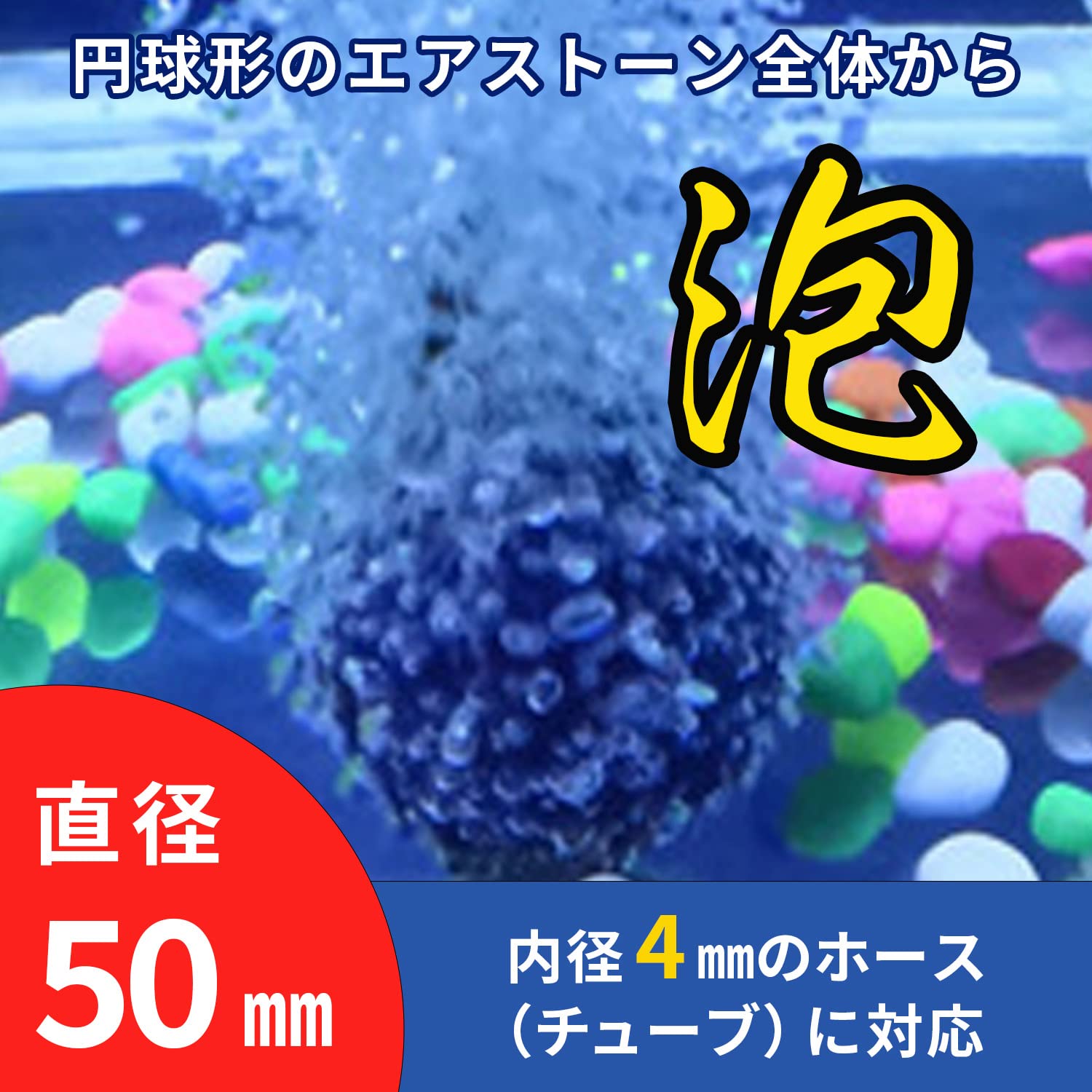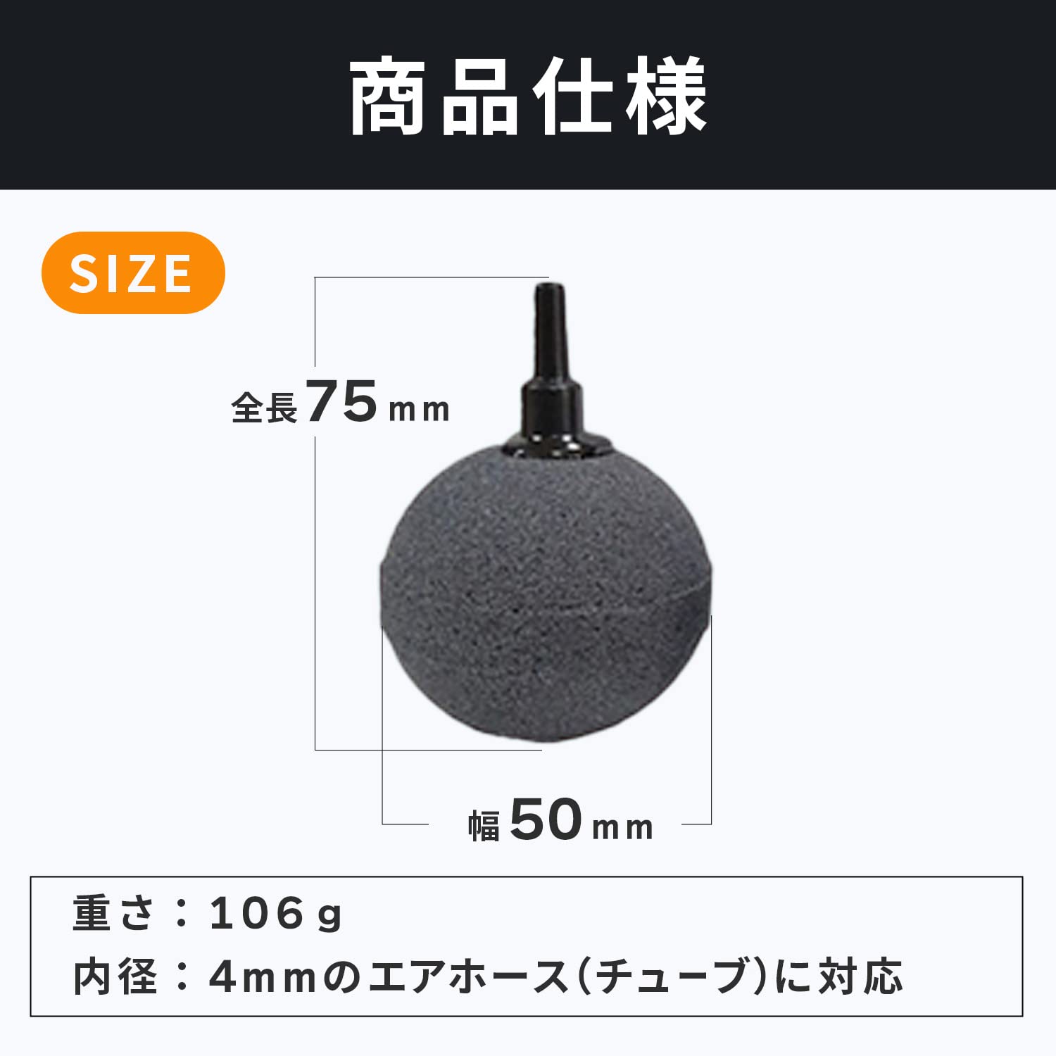 ご家庭の水槽に空気を送り込むエアーストーンです。球型の石となります。 50mmとやや大きめサイズです。エアーポンプから送られた空気を静音で水槽に酸素を供給します。メダカや金魚・錦鯉などの観賞魚、トマト・ミニトマト・レタス等の野菜の水耕栽培にもお使いいただけ汎用性に優れています。また、大規模な水耕栽培や水族館など業務用としてもお使いいただけます。 【仕様】球(キューブ状)の直径50mm・全長75mm。約106g/1個。カラー:グレー 内径4mmのエアホースに対応。 バリエーション:5個、10個、20個セットの3バリエーション 【注意点】まとめての梱包・配送となるため、配送上エアストーン同士が擦れて、小さく変色する場合がございます。使用上は、問題なくお使いいただけます。ご了承ください。ご使用前にエアストーンを15分間水に浸してください。エアーの出が良くなります。