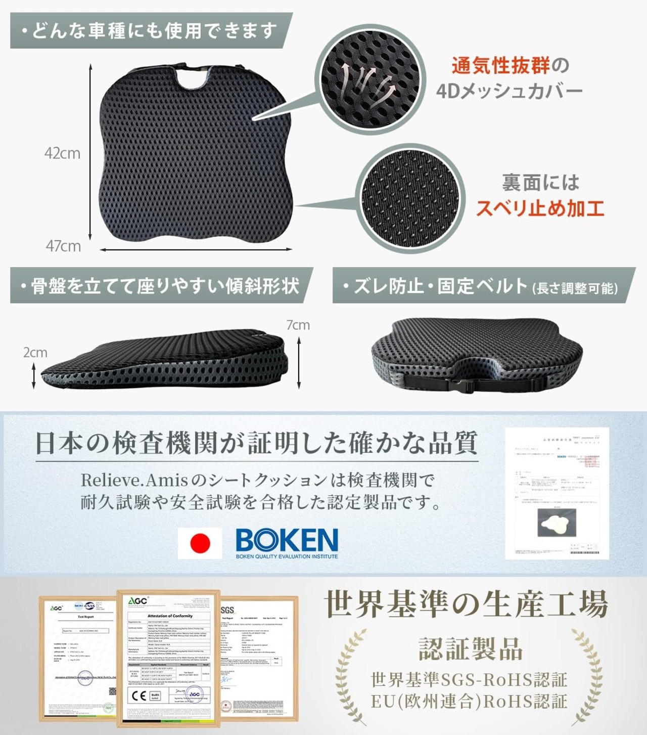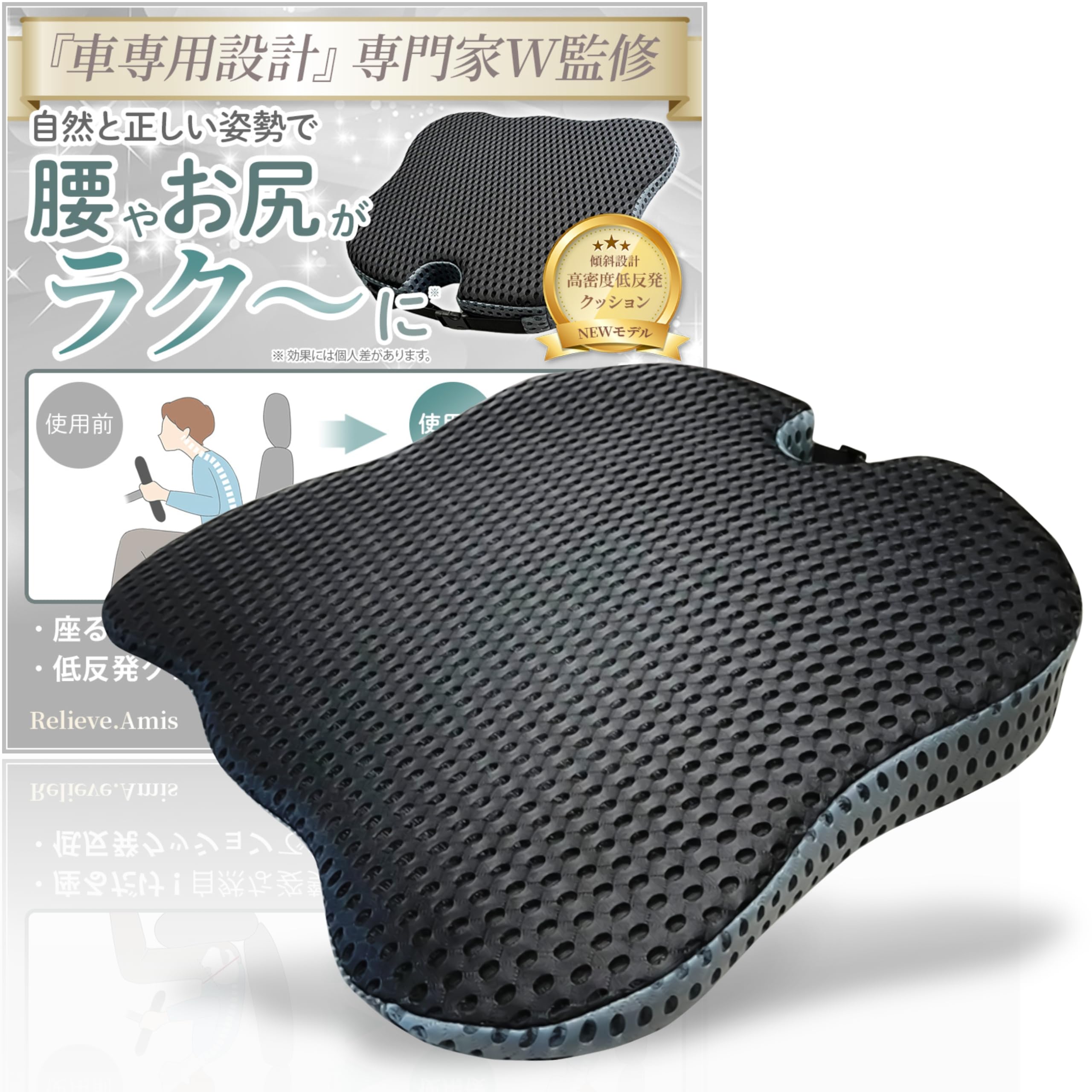 Relieve.Amisのシートクッションは専門家の監修のもと、車の座席に特化したシートクッションで、シートの上に置いて座るだけで快適な座り心地と良い姿勢へと導き、お尻の負担を軽減する座布団です。