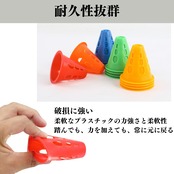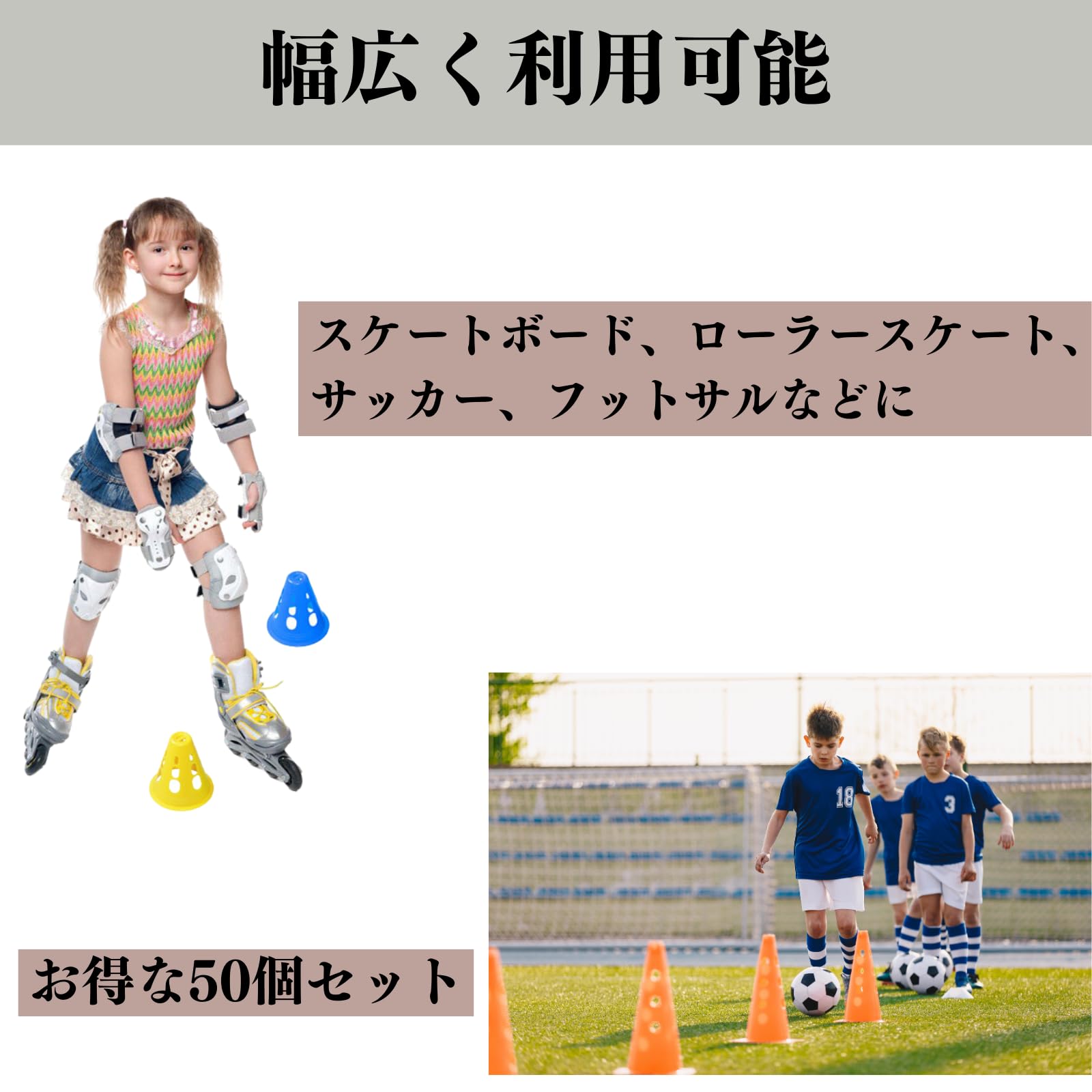 【ミニマーカーコーン50個セット】明るく鮮やかなカラーの三角コーンで、コーナーリング、ラインや着地ポイントなどの目印に最適です。<br><br> 【耐久性抜群】柔軟で丈夫なプラスチック製で、踏んでも力を加えても元に戻り、破損しにくく長持ちします。<br><br> 【持ち運びに便利】重ね収納で運動会やイベント会場などでの設置や撤収がスムーズに行えます。超軽量かつミニサイズで、さらにコンパクトに収納できるため、持ち運びが簡単です。<br><br> 【強風でも揺るがない】コーンがくり抜かれており、風に対して強く倒れにくい設計となっています。サッカーやフットサル、陸上競技など、さまざまなスポーツに最適です。<br><br> 【幅広く利用可能】スケートボード、ローラースケート、インラインスケート、サッカー、フットサル、陸上競技、バトミントン、幼稚園の運動会、イベントの設置など、幅広くお使いいただけます。屋内外問わず様々なスポーツで活躍します。<br><br> お得な50個セット:一度に大量使用する際に活躍する、お買い得50個セット!<br><br> 【セット内容】●サイズ: 直径 78mm ●高さ: 75mm ●10個の高さ:12cm ●重量:1個あたり7g ●素材:プラスチック(ABS樹脂)