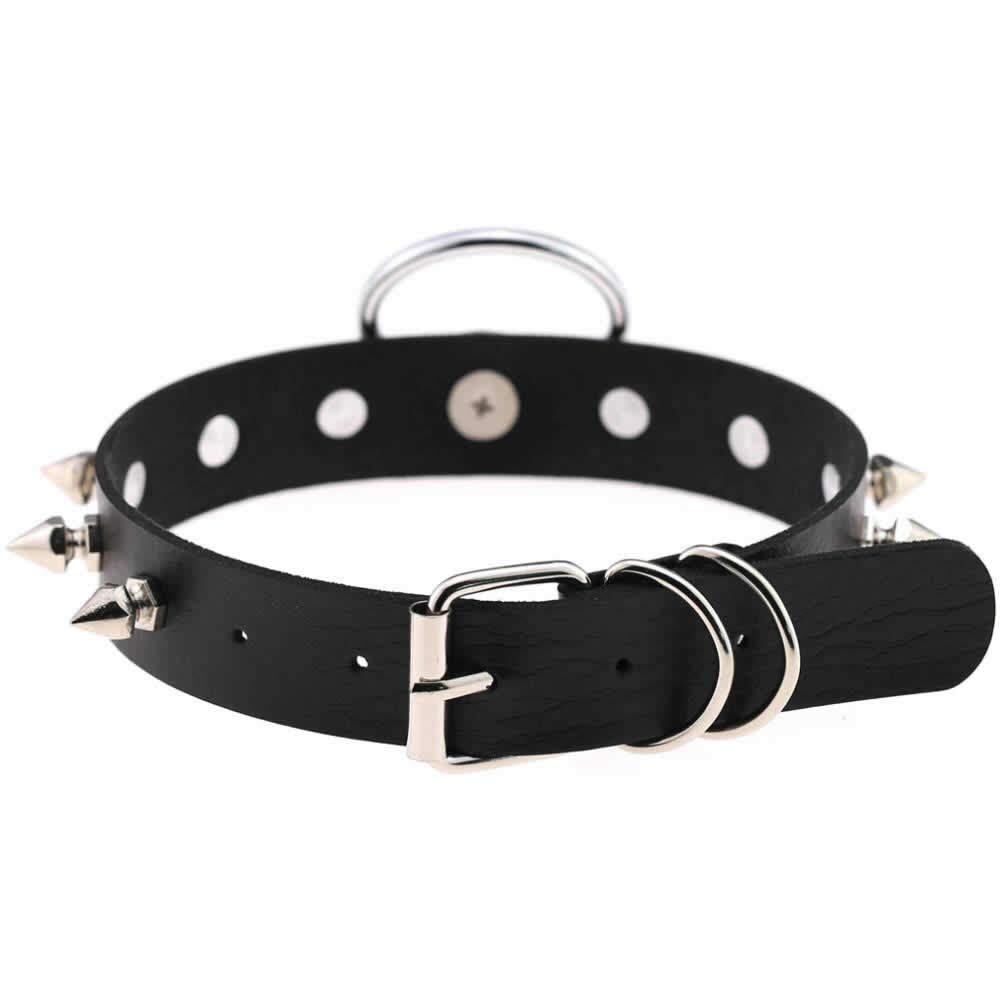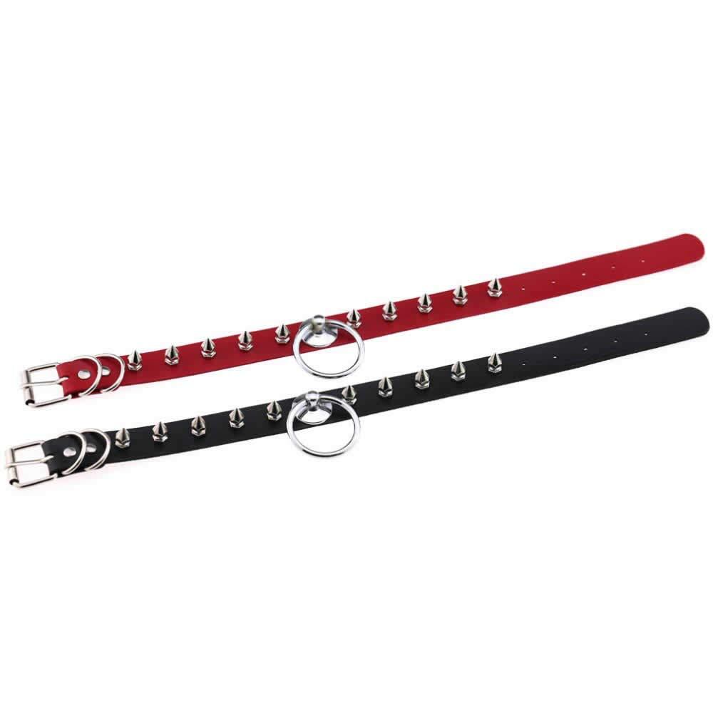 ブラック(黒色)、レッド(赤色)のフェイクレザーのネックレスのトップに大きな銀色のリングと周りをトンガリのスパイクコーンをセットしたパンクロックな首輪のようなレザーチョーカー。犬のリードのような女友達同士で楽しめるフェチなアイテム。 SM風のボンデージ(ボンテージ)ネックレスは、パンクロックな雰囲気を演出してくれるアクセサリー。ゴスロリファッションやハロウィーンパーティの仮装にも使えるユニークで存在感のある首飾り。メンズでもレディースでも使えるおしゃれなアイテム。あそび心ある面白い皮チョーカー。プレゼントにも。