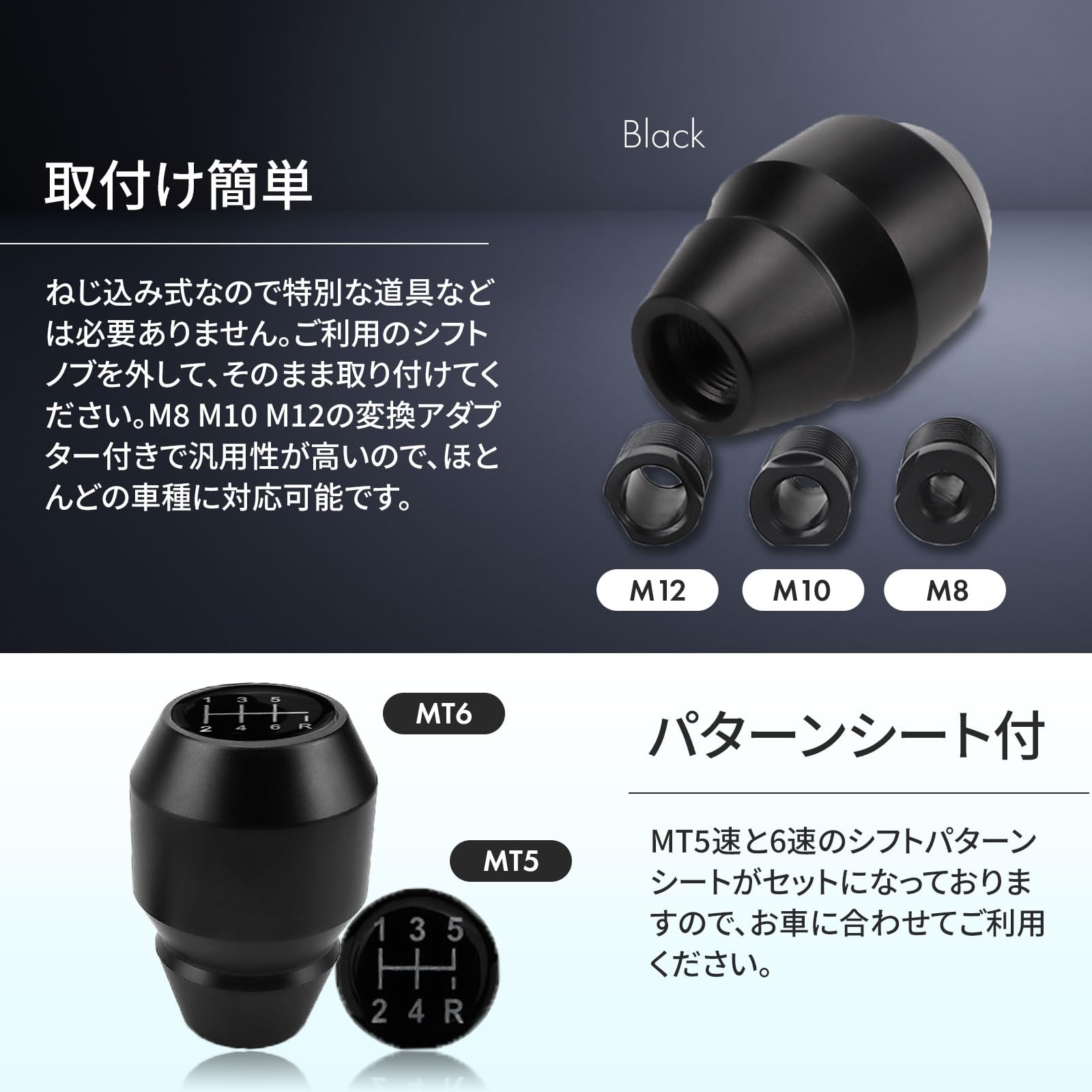 運転をより楽しく:スポーティーなアルミ シフトノブ mtは、約250gと適度な重さで、シフト操作がいつもよりスムーズになることが期待できるノブです。これによりシフトタイムが短縮され、ストレスなくスポーティーな運転体験をお楽しみいただけます。スタイルのアップグレードに:シフト ノブは、アルミの質感を放ちシンプルかつスポーティーなので、ダッシュボードやコンソールの雰囲気を一新し、より魅力的な車内の演出に役立ちます。取付簡単:特別な道具なども必要なくねじ込み式ですので、ご利用のシフトノブを外して、そのまま取り付けていただくだけです。MT5速とMT6速のシフト パターン シートがセットになっておりますので、お車に合わせてご利用ください。また、M8 M10 M12の変換アダプター付きで汎用性が高いので、ほとんどの車種に対応可能です。車種別の取付サポートは行なっておりません。海外輸入製品のため取扱説明書等もございませんので、お車に詳しくない場合は専門業者様へご依頼くださいませ。サイズとカラー:サイズ:(高さ70mm 幅49mm)・カラー:(ブラック ブルー レッド ガンメタ)の4種類のカラーからお選びいただけるアルミ製 シフトノブです。
