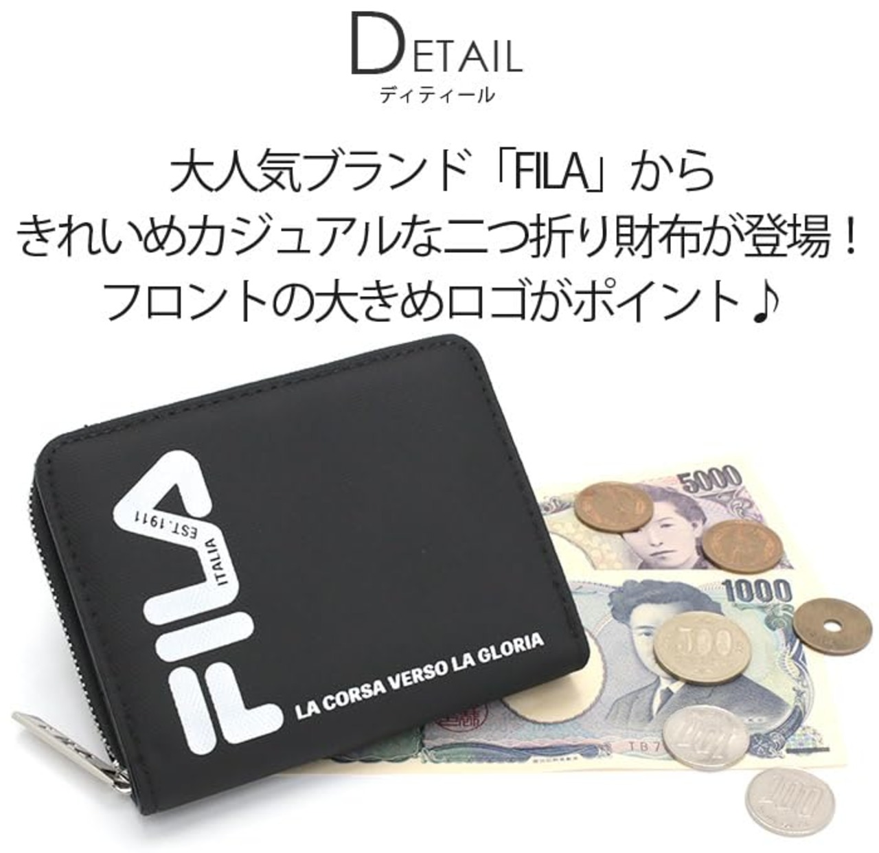 スポーティ・カジュアルブランド【FILA】より、シンプルな二つ折り財布が登場♪<br>つや消しの本体に、大きめロゴプリントがおしゃれです。<br>スナップボタンを開けると札入れと、カードポケット×4、フリーポケット×4があります。<br>小銭入れはファスナー開閉で大きく開くので、中が見やすく取り出しもスムーズ。<br>仕切りで2層に分かれており、すっきりと小銭を収納できます。<br>お財布デビューやプレゼントにもオススメ◎<br>ファッション性も機能性も兼ね備えたお財布です。<br>■サイズ:約W12×H10×D3(cm)※寸法は目安です。メーカーサイズ参照のものや自社採寸のものがございますので、実際の商品とはやや異なる場合がございます。<br>■素材:ポリエステル<br>■ポケット:札入れ×1、小銭入れ×1、カードポケット×4、フリーポケット×4