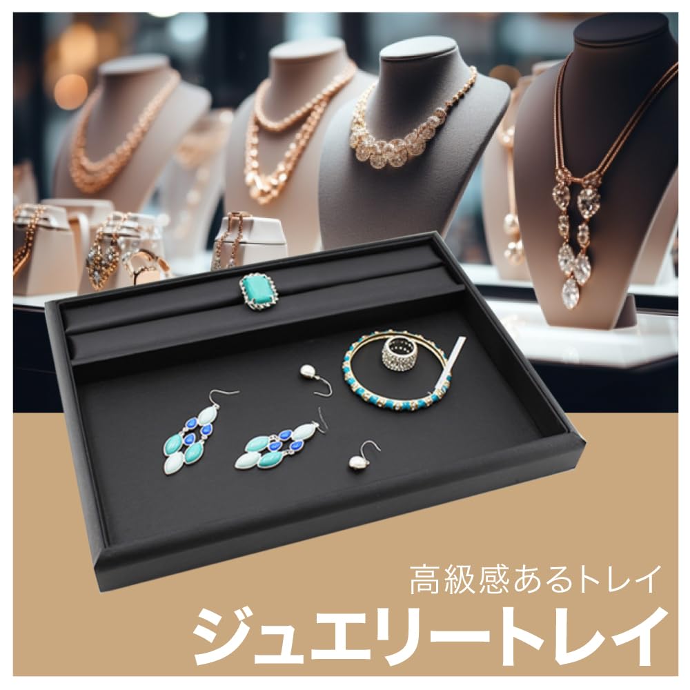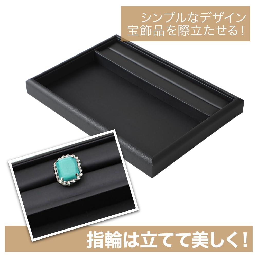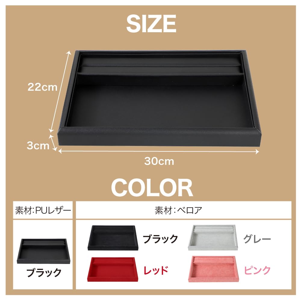 【高級感のある素材】シンプルなフラットタイプのジュエリー収納トレーです。お気に入りのジュエリーやアクセサリーを美しくディスプレイできます。リング溝付きなので、指輪の収納も可能です。