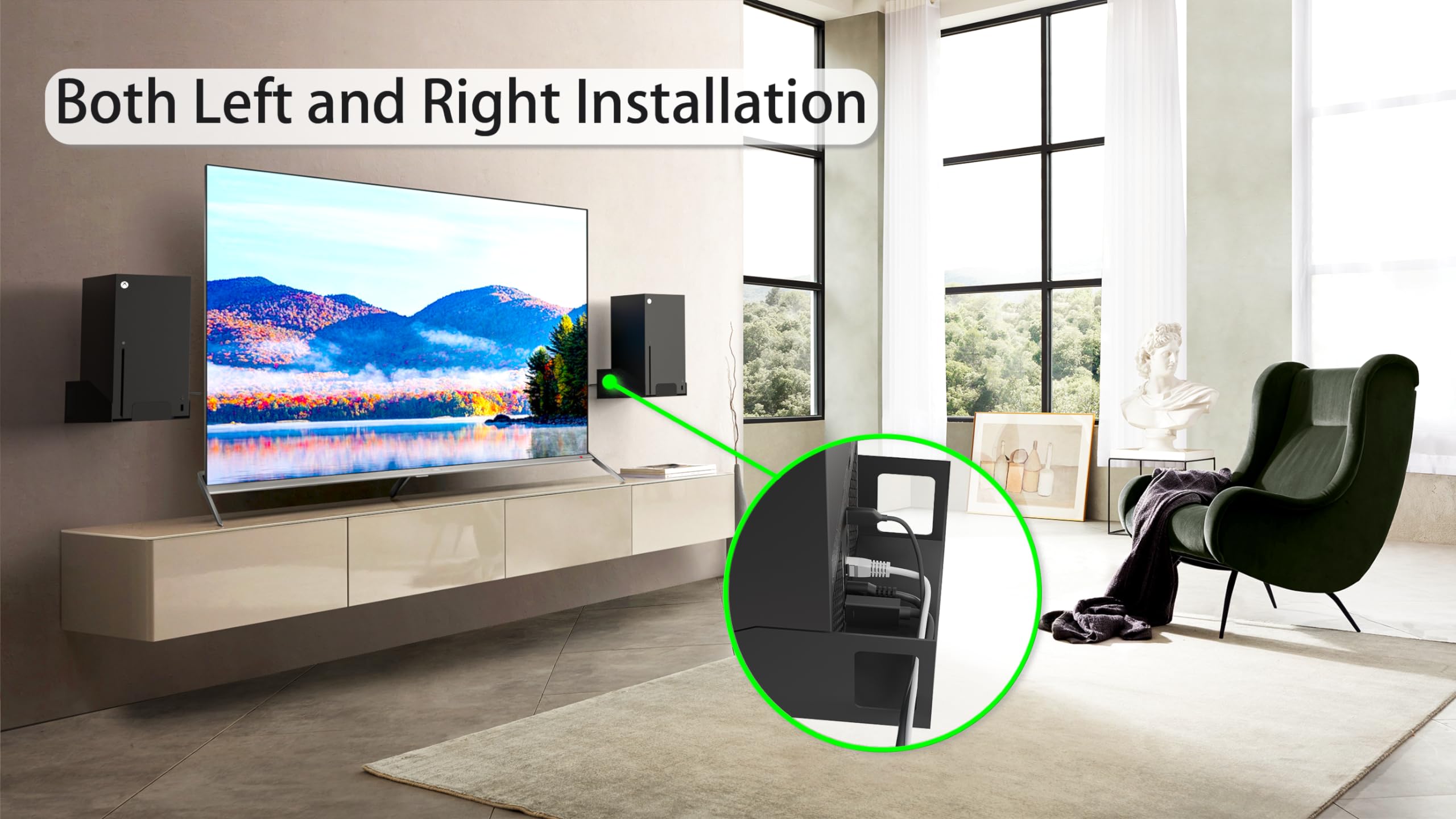 Xbox ウォールマウントの取り付けは簡単で、複数の取り付けオプションがあります。 テレビの左右の位置を選んで、この Xbox Series X スタンドは、ディスク取り出しが妨げられず、拡張カード、HDMI、USB、イーサネット、電源ケーブルへのシームレスな接続を可能にします。