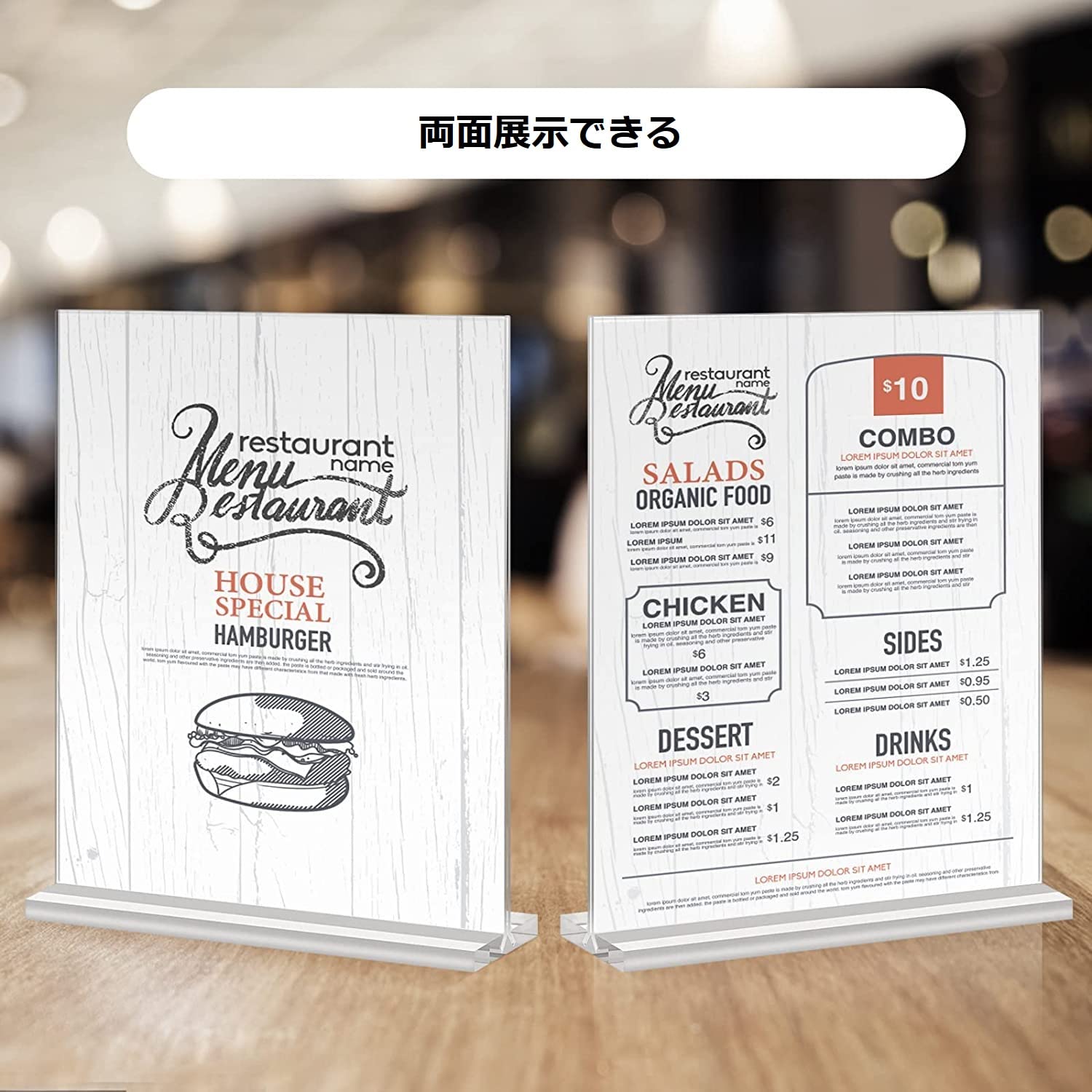 【両面ディスプレイ】:この両面スタンドは、片面しかディスプレイできないスラントバックスタンドとは異なり、両面にディスプレイすることができます。店頭陳列商品のプライスカード、POPカード、商品PRカード簡単な説明書などを入れることができます。コーヒーショップチェーン店や家具雑貨店、各種ショップでのレジ横の案内板としてもお使いいただいております。