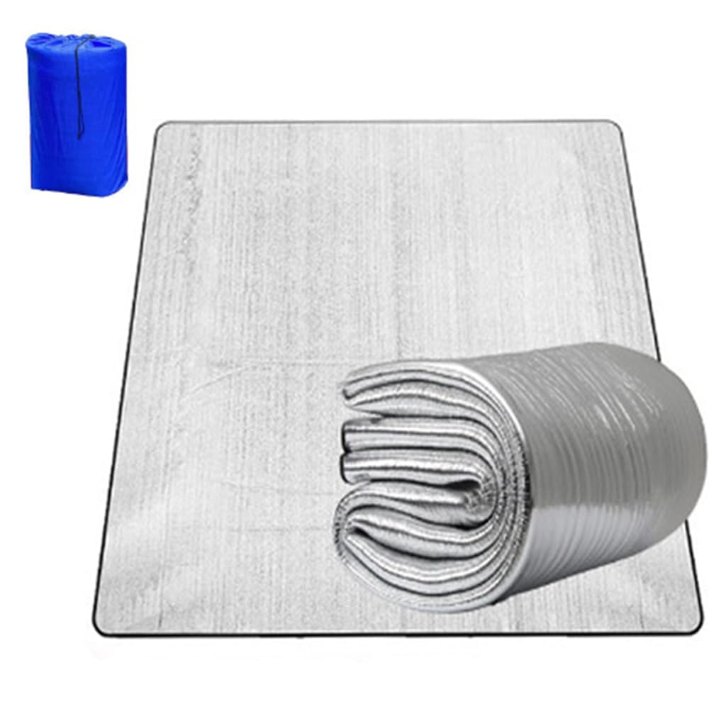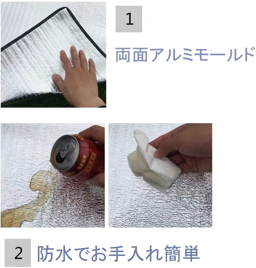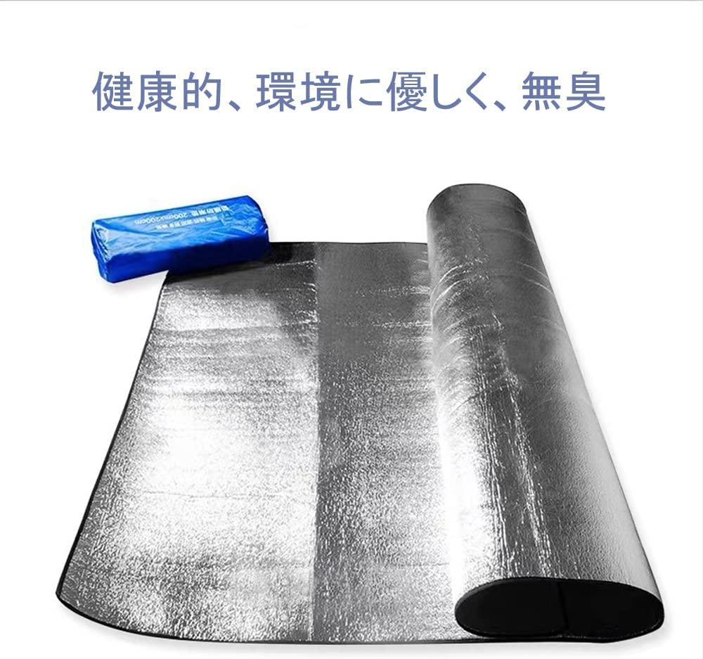 【3層の構造で湿気遮断、断熱と保温】中間層は発泡ポリエチレンで作られるので一層柔らかくなり、快適にご利用いただけます。両面にはアルミ蒸着が施されているため使用中は内側の熱が外部に放散せず、外部の湿気や冷気も遮られます。保温性、断熱性が抜群です。キャンピング時は、テント内で寝袋下にインナーシーツとしても、テントシートとしても使うことができ、体温が保たれるので快適に利用できよう。<br/>【撥水加工、持ち運びに便利】撥水加工で雨や汚れに強く、速乾性に優れています。外出中に急な雨に見舞われると傘として使えます。汚れが付いたら水だけで洗えば、あるいは簡単に布で拭けば元に戻ます。折り畳むとブロック状にまとまるので、収納が簡単です。超軽量ので、ショルダーベルト付きの収納袋に入れれば、どこにでも持ち運ぶことができます。<br/>【掃除しやすい・多用途】汚れた場合は布で拭くと、綺麗になります。拭き取ってできない場合に、ぬるま湯や中性洗剤を含ませた布などでもう一度拭き取ってください。お花見や行楽は無論、キャンプ、車中泊、防災、遠足、運動会、ピクニックなど様々なイベントに大活躍しているレジャーシートです。そして、引き出しの底に敷いて、ビニールプールの下敷き、いろいろな用途は発見中です。<br/>【多目的シート】普段はレジャーシート、キャンプシート、テントシート、寝袋のインナーシーツ、車中泊用マットレス、運動会用マットなどとして使用でき、急な気温変化や災害の時はエマージェンシーシート(保温シート)として使用可能な銀マットです。<br/>【ご注意】ハイヒールなど鋭い物との接触を避けてください。生産ロートによって、サイズは3~5㎝誤差(裁断、縫製のため)があります。予めご了承ください。