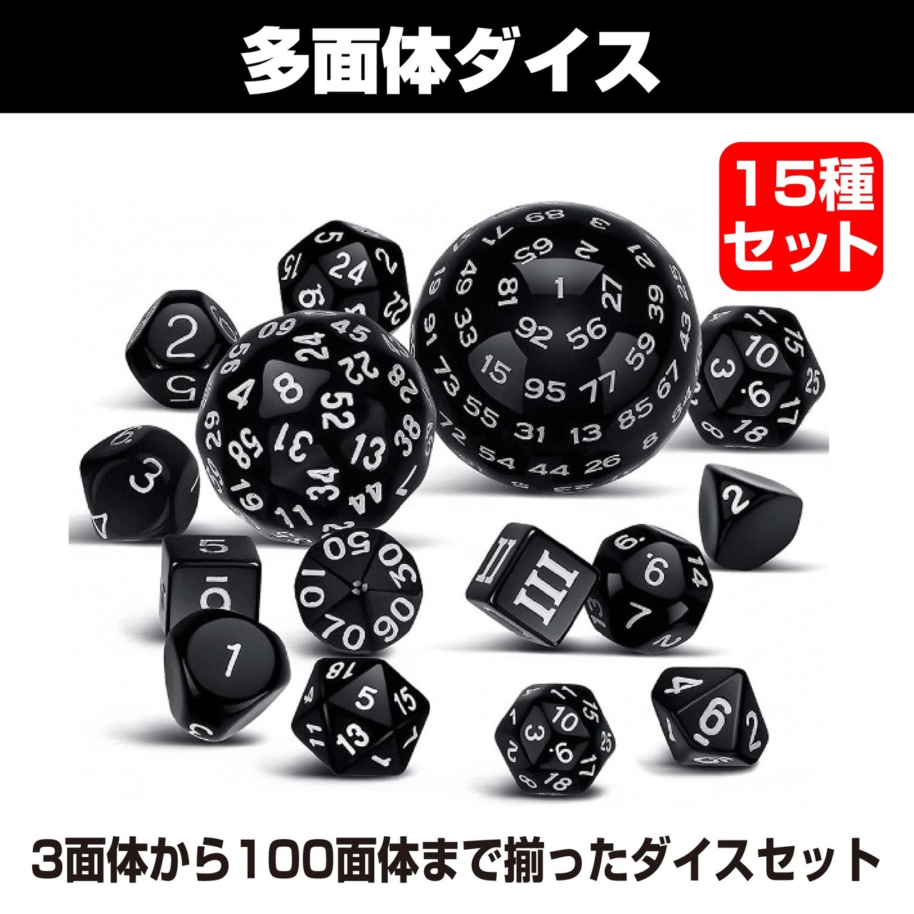 3面体から100面体まで揃ったダイスセット:3面体ダイスから100面体ダイスまでの15種類のダイスが揃った、多面体ダイスセットです。ボードゲームやカードゲームなどのテーブルゲームから、マジックや手品まで、幅広く使えるダイスセットです。<br><br>ダイスの数字を判別しやすい:ダイスの本体カラーがブラックカラーで、刻まれている数字のカラーがホワイトとなっているので、ダイスの数字をすぐに判別しやすいです。ゲームで使用するダイスをお探しの方にもおすすめです。<br><br>持ち運びもしやすい:どの多面体ダイスもサイズが大きすぎないので、まとめて袋などに入れて持ち運ぶこともできます。15種類のダイスが揃っているので、遊ぶゲームなどに合わせてダイスを使い分けることができます。<br><br>様々なゲームで使える:ロールプレイングゲームやボードゲーム、カードゲーム、各種パーティーゲームなど、様々なゲームでお使いいただくことができます。1セット持っておけば、パーティーなどで役立つでしょう。<br><br>セット内容:15種セット カラー:ブラック×ホワイト 材質:アクリル ※モニターの環境等により、色の見え方に若干差が生じる場合がございます。