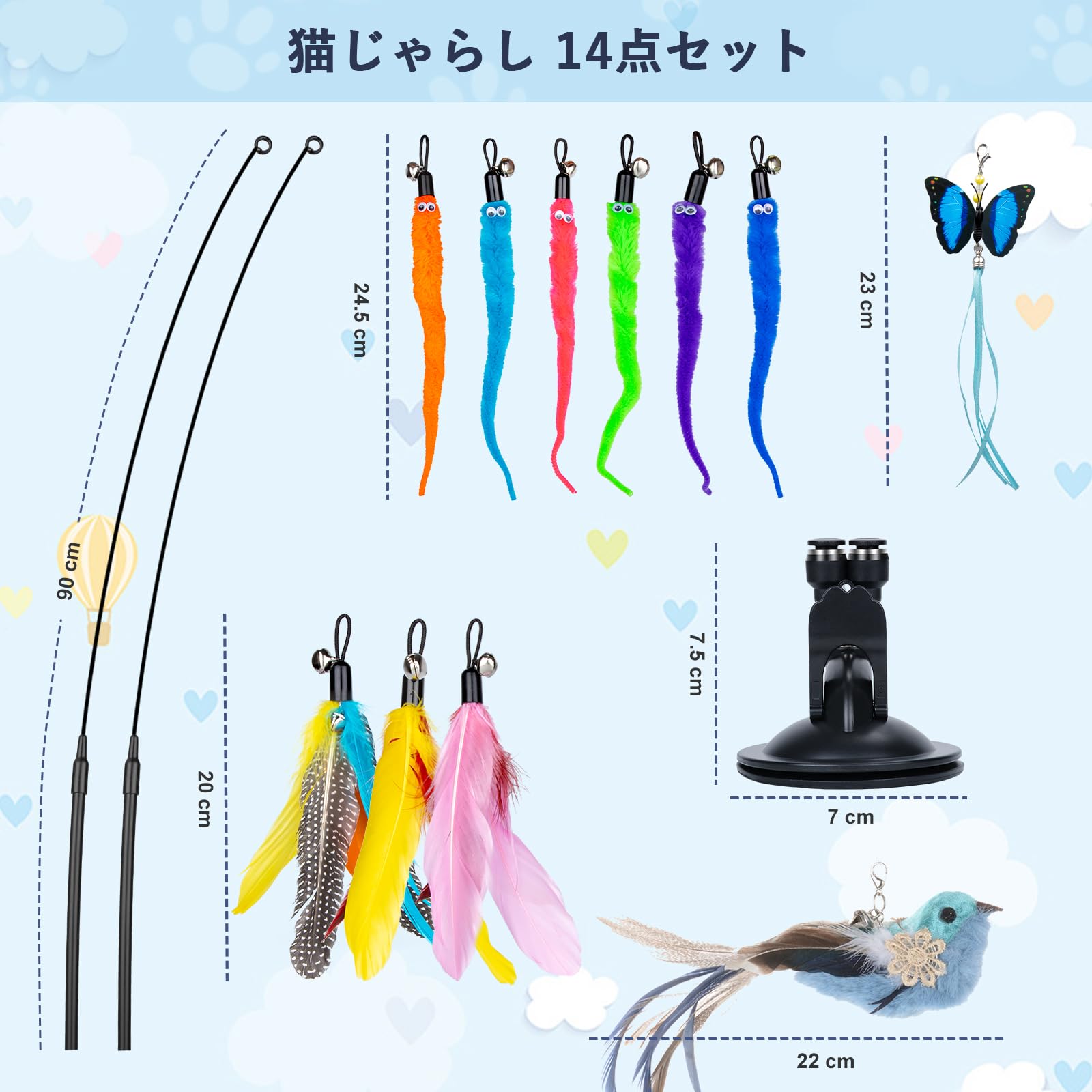 猫おもちゃ 猫じゃらしOziral 吸盤じゃらし 自動 猫用おもちゃ 釣り竿 回弾可能 運動不足解消 ストレス解消 鳥/毛虫/蝶 交換用玩具11本 鈴付き 子猫 猫遊び用品 屋内 ペット用品(14点セット)