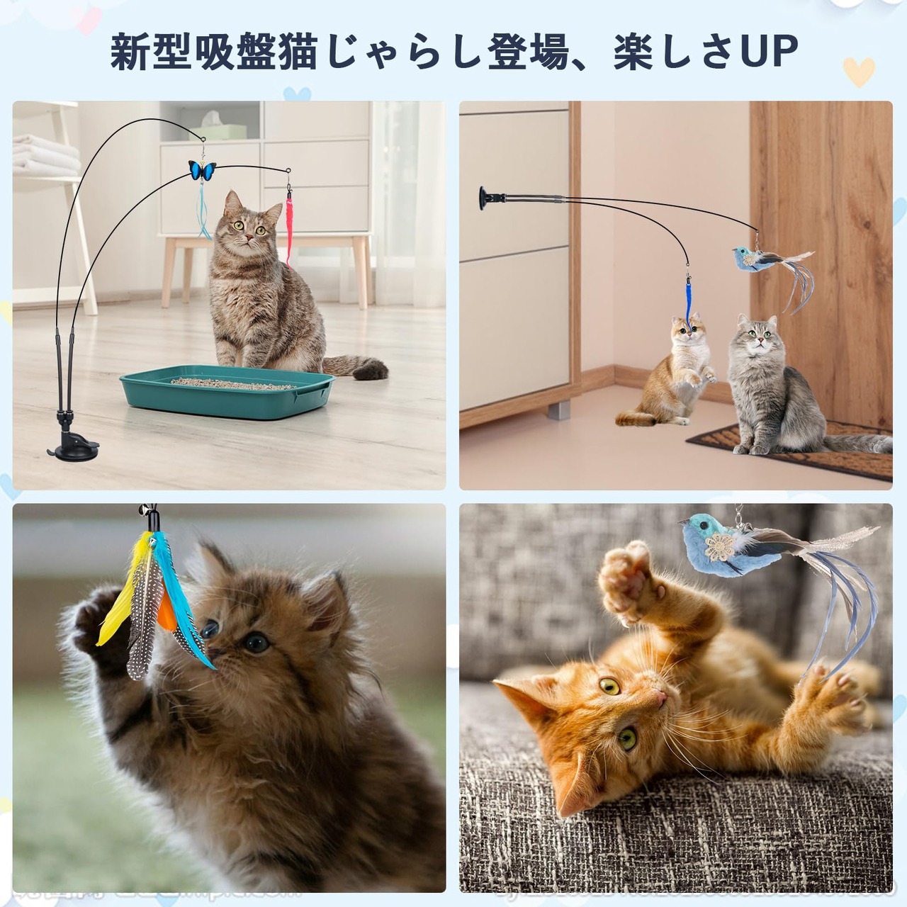 【新型吸盤登場+ダブル吸盤式猫じゃらし】新しい吸盤が登場し、これまでの吸盤よりも釣り竿を1本多く挿入することができ、複数の猫がいる家庭に適しています。もちろん、猫1匹だけでも使えます。2つの釣り竿を使って異なる種類のおもちゃを組み合わせることで、猫の遊びをより魅力的にします。