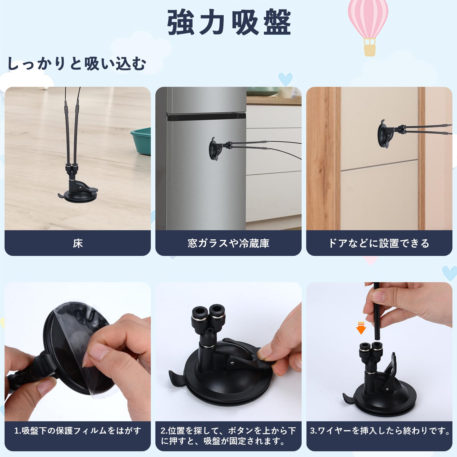 【吸盤式猫じゃらしセット】猫じゃらしセットには、ダブル吸盤と、ワイヤーの釣り竿、様々な交換用玩具がセットされて、釣り竿におもちゃをかけ、吸盤に挿入して固定すると、振り上げやすくなり、猫を猫を引きつけてジャンプしたり、おもちゃを追いかけたりします。