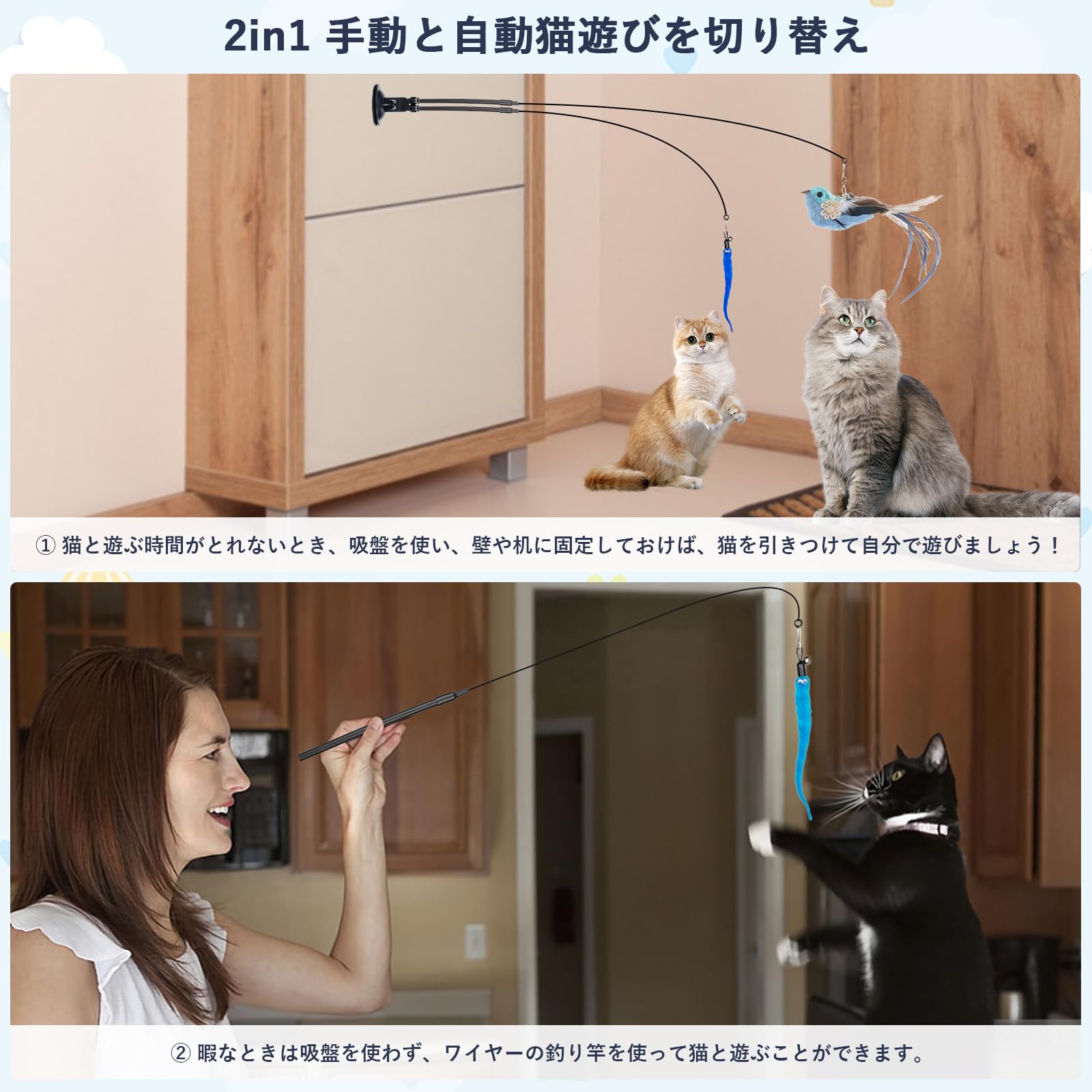 【手動自動の猫遊びを切り替え】忙しい時は、ワイヤーやおもちゃでを吸盤式猫じゃらしを作り、壁/床に固定します。弾力性のあるワイヤーは少し触れるだけで自動的に揺れ、猫を引きつけて自分で遊びましょう!暇なときは釣り竿でおもちゃを締めたり、手動で猫をからかったりして楽しんで!多頭飼いの家庭へぴったりです。