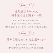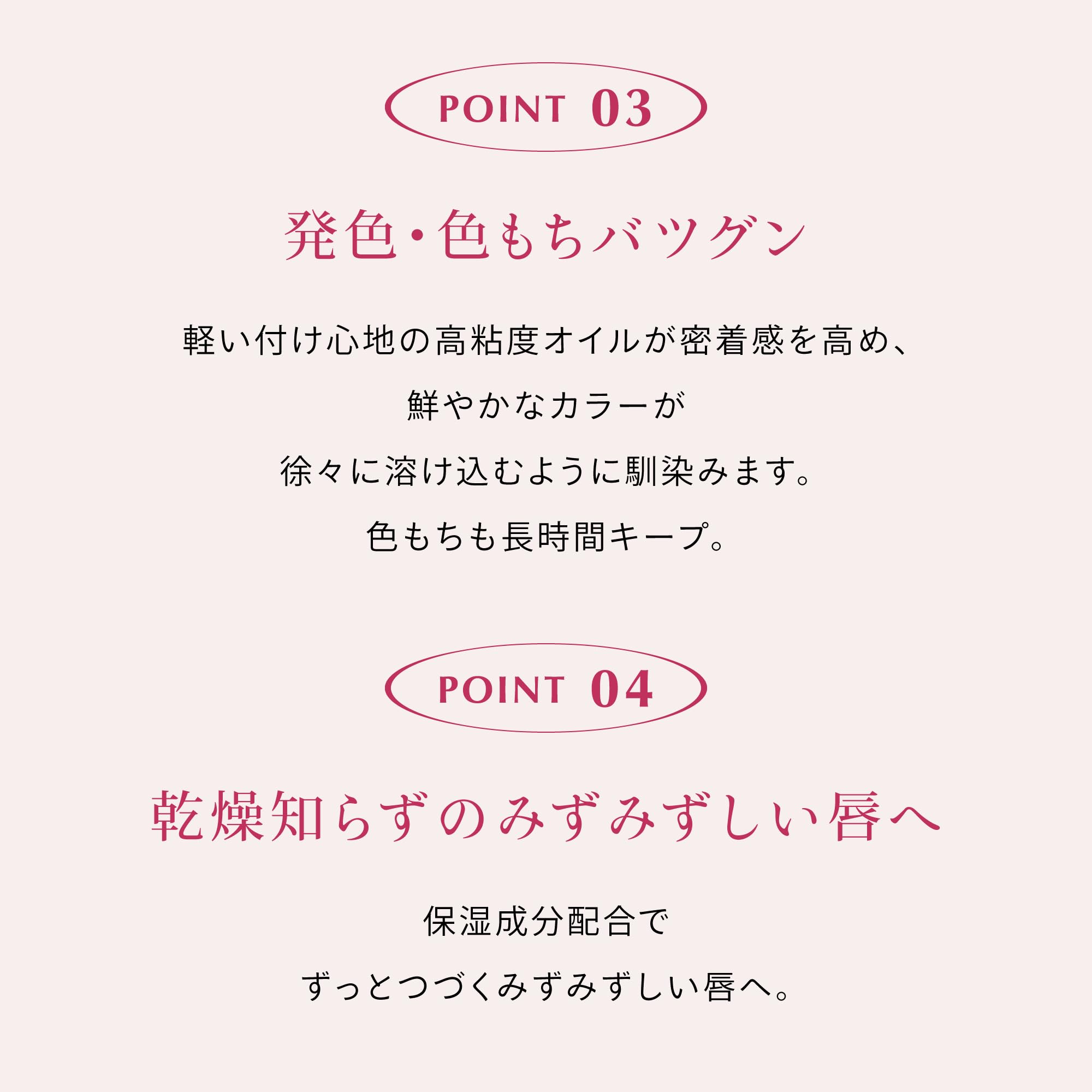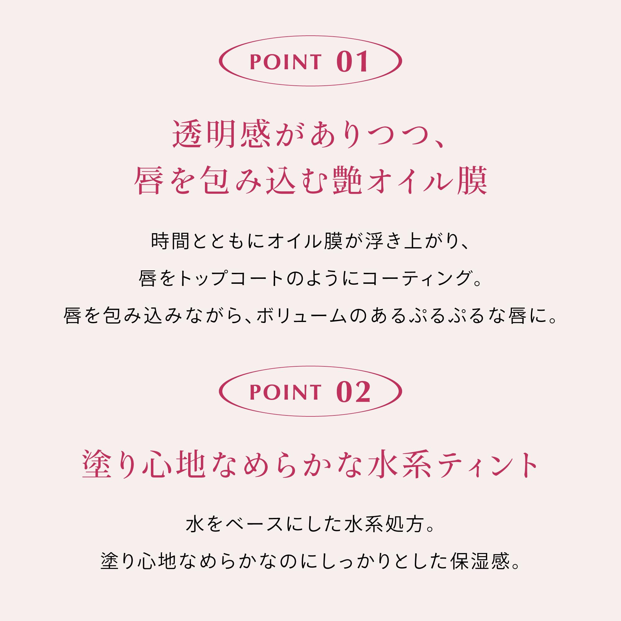 【商品について】01 透明感がありつつ、唇を包み込む艶オイル膜 時間とともにオイル膜が浮き上がり、唇をトップコートのようにコーティング。 唇を包み込みながら、ボリュームのあるぷるぷるな唇に。 02 塗り心地なめらかな水系ティント 水をベースにした水系処方。 塗り心地なめらかなのにしっかりとした保湿感。 03 発色・色もちバツグン 軽い付け心地の高粘度オイルが密着感を高め、鮮やかなカラーが徐々に溶け込むように馴染みます。 色もちも長時間キープ。 04 乾燥知らずのみずみずしい唇へ 保湿成分配合でずっとつづくみずみずしい唇へ。