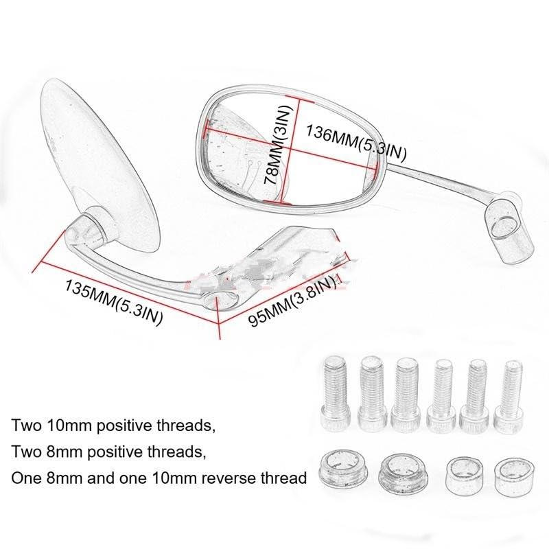 運転支援の非常に優れたヘルパーです。 後ろから来る車をはっきりと確認できるため、走行の安全性が向上します。<br/>▶仕様:<br/><br/>材質: 金属ステムと ABS プラスチックミラーハウジング<br/>色: 黒<br/>重量: 850g<br/>ミラー:クリア<br/><br/>▶ 特徴:<br/><br/>1.素敵なスイベルデザインであらゆる角度に簡単に調整可能<br/>2.あなたのバイクを瞬時にカスタムの目を引く外観にアップグレードします。<br/>透き通った白いガラスは昼も夜も鮮明な視界を提供します<br/>洗練されたスタイリッシュなデザイン!<br/>3.シングルマウントボルトミラーを使用しているすべてのオートバイに直接ボルトオン<br/>4.バックミラーの取り付け口径は8mmと10mmです。<br/><br/>▶ パッケージ内容:<br/><br/>オートバイ用ミラーのペア