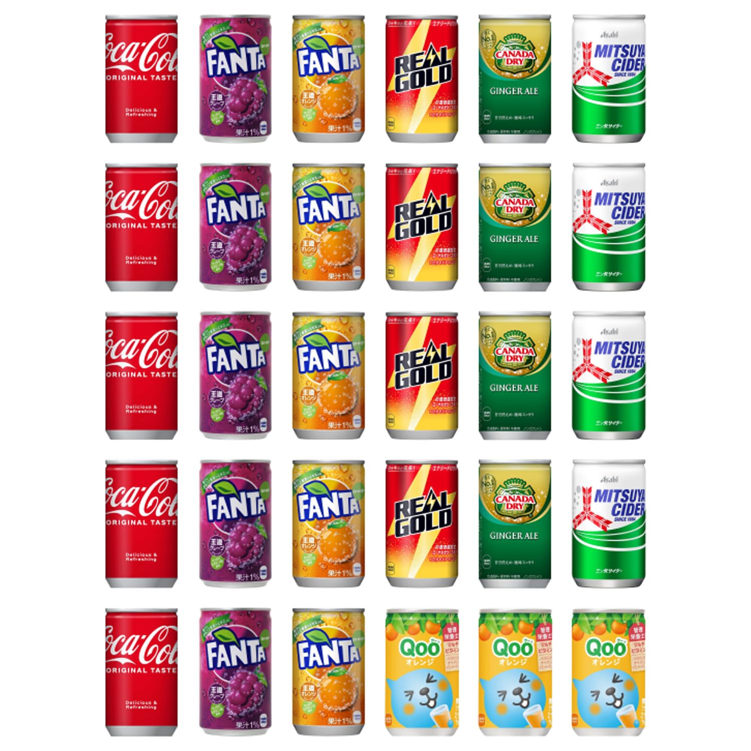 【セット内容】コカ・コーラ ×5、ファンタグレープ ×5、ファンタオレンジ ×5、リアルゴールド ×4、ジンジャーエール ×4、三ツ矢サイダー ×4、Qoo ×3