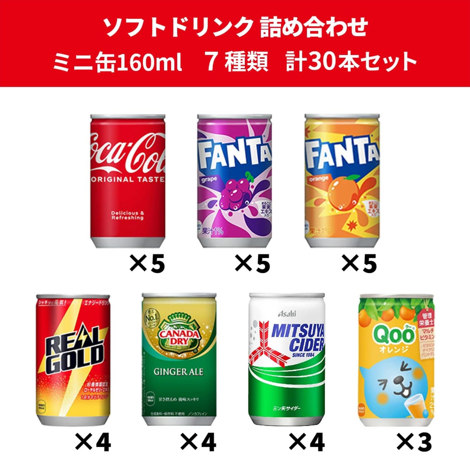 ちょうどいい飲みきりサイズを色々な種類で詰め合わせにしました。<br> そのまま飲んでも、アルコール割りにもお勧めです。<br><br> 少量サイズだからいつでも新鮮な炭酸をお楽しみいただけます。<br> パーティーや贈り物にも喜ばれると大人気の炭酸飲料<br><br> 【セット内容】<br> ・コカ・コーラ ×5<br> ・ファンタグレープ ×5<br> ・ファンタオレンジ ×5<br> ・リアルゴールド ×4<br> ・ジンジャーエール ×4<br> ・三ツ矢サイダー ×4<br> ・Qoo ×3<br><br> 160ml缶 7種 計30本