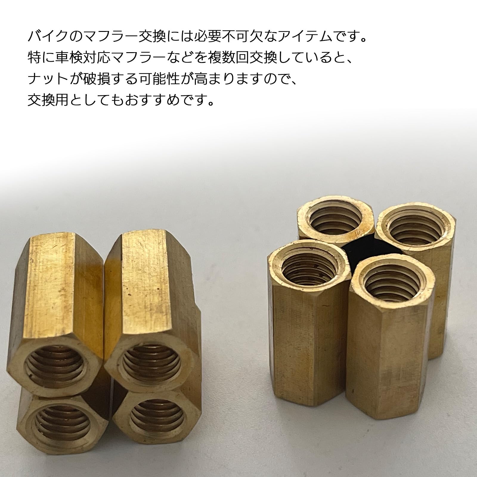 真鍮製のため、耐腐食性に優れ、美しいゴールドカラーがバイクのドレスアップにも一役買います。多くのバイクは1気筒あたり2個のナットを使用するため、2気筒バイクには4個セット、4気筒バイクには8個セットが最適です。エキパイの固定やその他のカスタム用途にも活用できます。