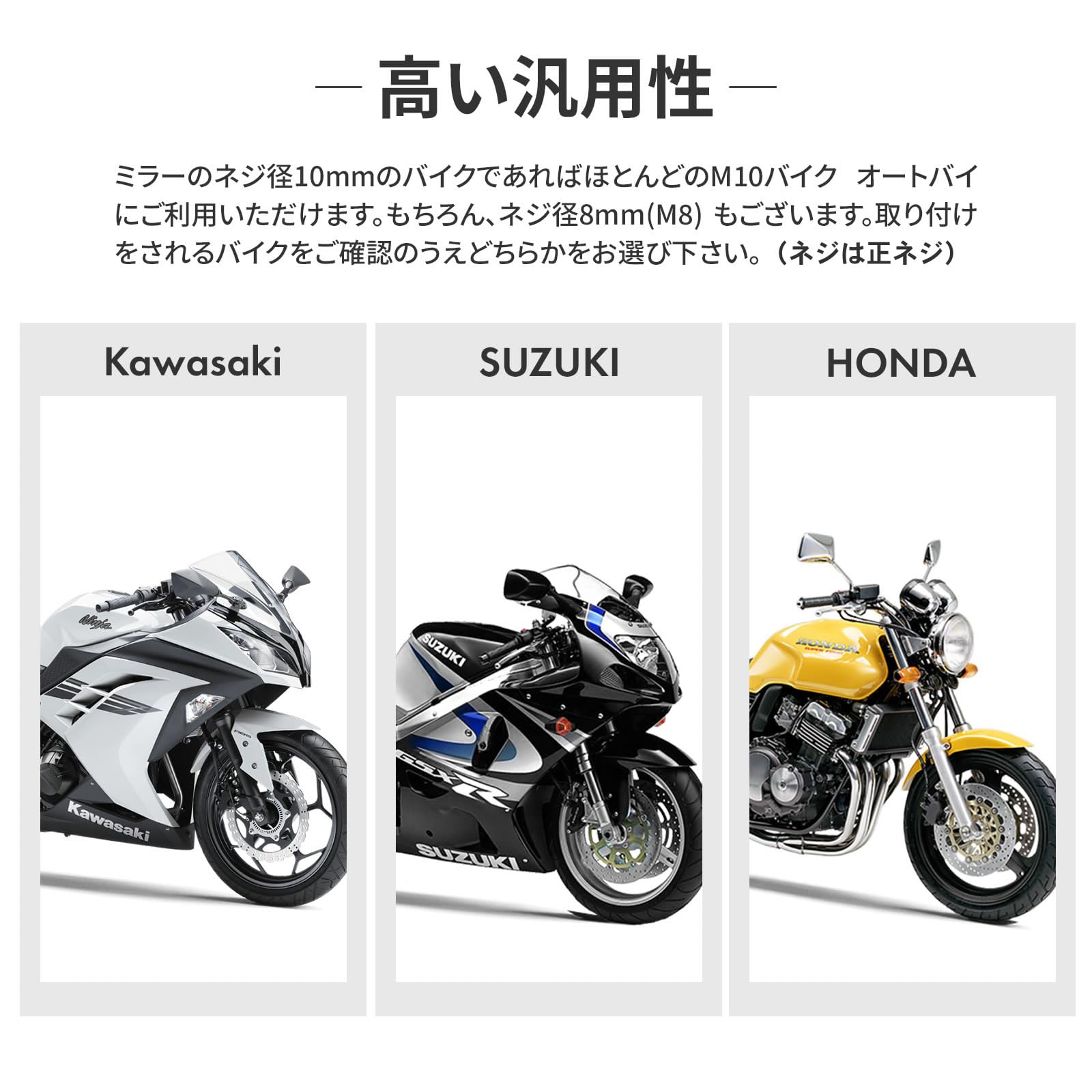 高い汎用性:ミラーのネジ径:10mmのバイクであれば、ほとんどのM10 バイク オートバイにご利用いただけます。※正ネジになります。逆ネジのバイクの場合は別途アダプターなどが必要となります。