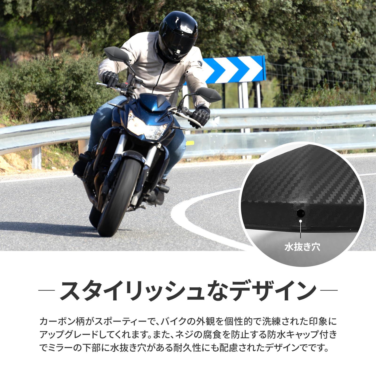 大きく見やすい鏡面:バイク ミラーが大きく広い視野を確保できるので、小型の丸型のバイクミラーなどに比べて、後方の交通状況を正確に把握することができます。また、ネジの腐食を防止する防水キャップ付きです。※ミラーの下部に水抜き穴あり。カーボン調のスタイリッシュなデザイン:カーボン柄がスポーティーで、バイクの外観を個性的で洗練された印象にアップグレードしてくれます。高い汎用性:ミラーのネジ径:10mmのバイクであれば、ほとんどのM10 バイク オートバイにご利用いただけます。※正ネジになります。逆ネジのバイクの場合は別途アダプターなどが必要となります。サイズ:ミラー:15.5cm 8.2cm・アーム部分:5.7cm 15cm・ネジ径:10mm M10・※汎用品となりますので個別の車種の取付に関するのサポートは行っておりません。恐れ入りますが、ご注文前に寸法や形状をよくご確認いただきご購入をお願いいたします。※本商品は海外製品のため、輸送中に細かい傷が生じる場合がございます。また切断面に多少のバリが残っている場合もございます。予めご了承くださいませ。