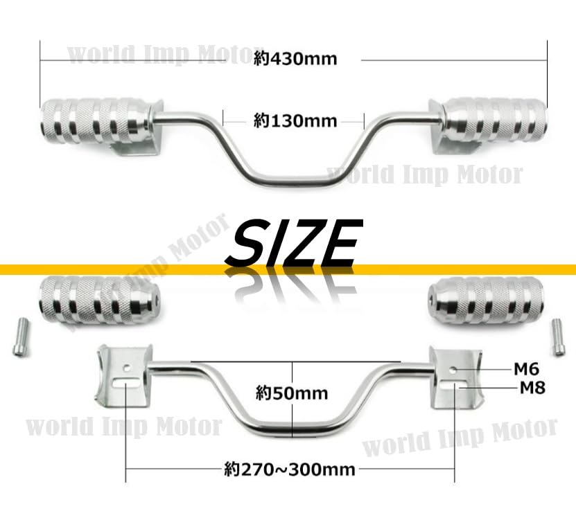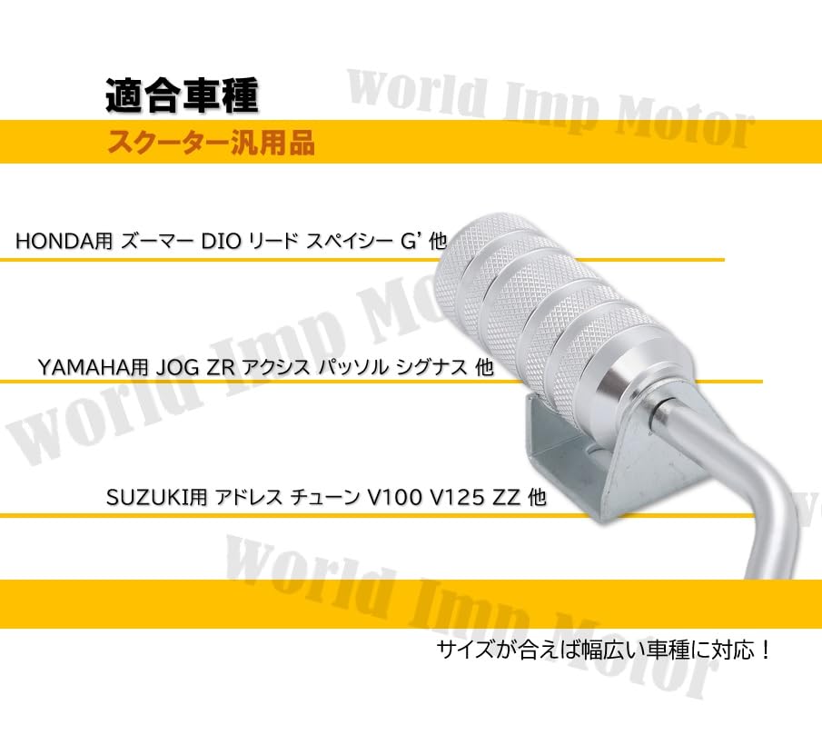 ✅ バイク 用 アルミ ステップバー の汎用品 になります。 <br><br> 【適合車種】 <br> ✅ スクーター 汎用 <br> ・HONDA 用 ズーマー DIO リード スペイシー G' 他 <br><br> ・YAMAHA 用 JOG ZR アクシス パッソル シグナス 他 <br><br> ・SUZUKI 用 アドレス チューン V100 V125 ZZ 他 <br><br> 【商品仕様】 <br> ・材質:アルミ製 <br> ・全長:約430mm <br> ・取付穴間(長穴部)<br> :約270mm~300mm <br><br> 【セット内容】 <br> ・アルミ フットステップ × 1 <br><br> 【商品説明】 <br> ✅ こちらは、スクーター 用 アルミ ステップバー になります。 <br><br> ✅ 汎用品 ですので ホンダ 用、ヤマハ 用、スズキ 用、など サイズ が合えば 幅広い車種に対応いたします。<br><br> ✅ 材質は 軽量アルミ を採用しており、愛車の ドレスアップ にもオススメの商品です<br><br>。 ✅ 本品を取り付けるだけで、しっかり踏ん張れて、走りが変わります!! <br><br> ✅ 日本には無い あなただけの 新しい カスタム を是非ご体感下さい。 <br><br><br> 【注意事項】<br> ※ 説明書等は付属しておりません。 <br> ※ 車体側に固定するビス等は付属しておりません。 <br> ※ ステップネジ部を利用するか、直接 タッピングビス などで固定してください。 <br> ※ ご購入前に サイズ 形状等を必ずご確認ください。<br> ※ 新品ですが海外製品になりますので、使用に支障のない程度の傷や汚れなどある場合がございます。ご了承ください。<br>