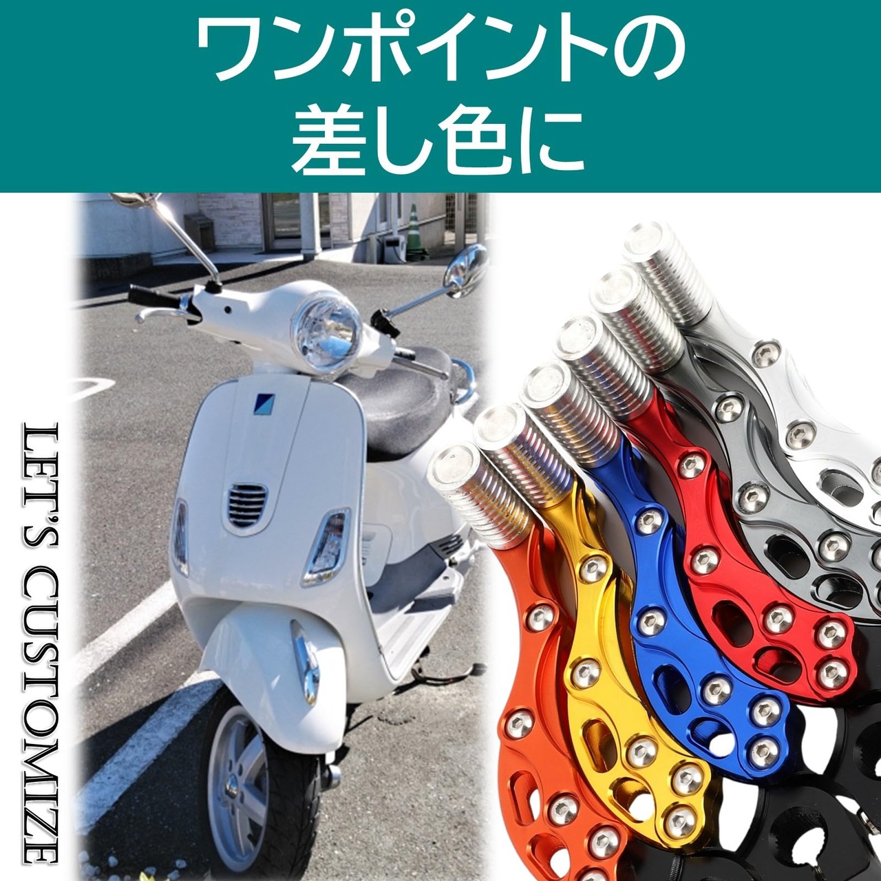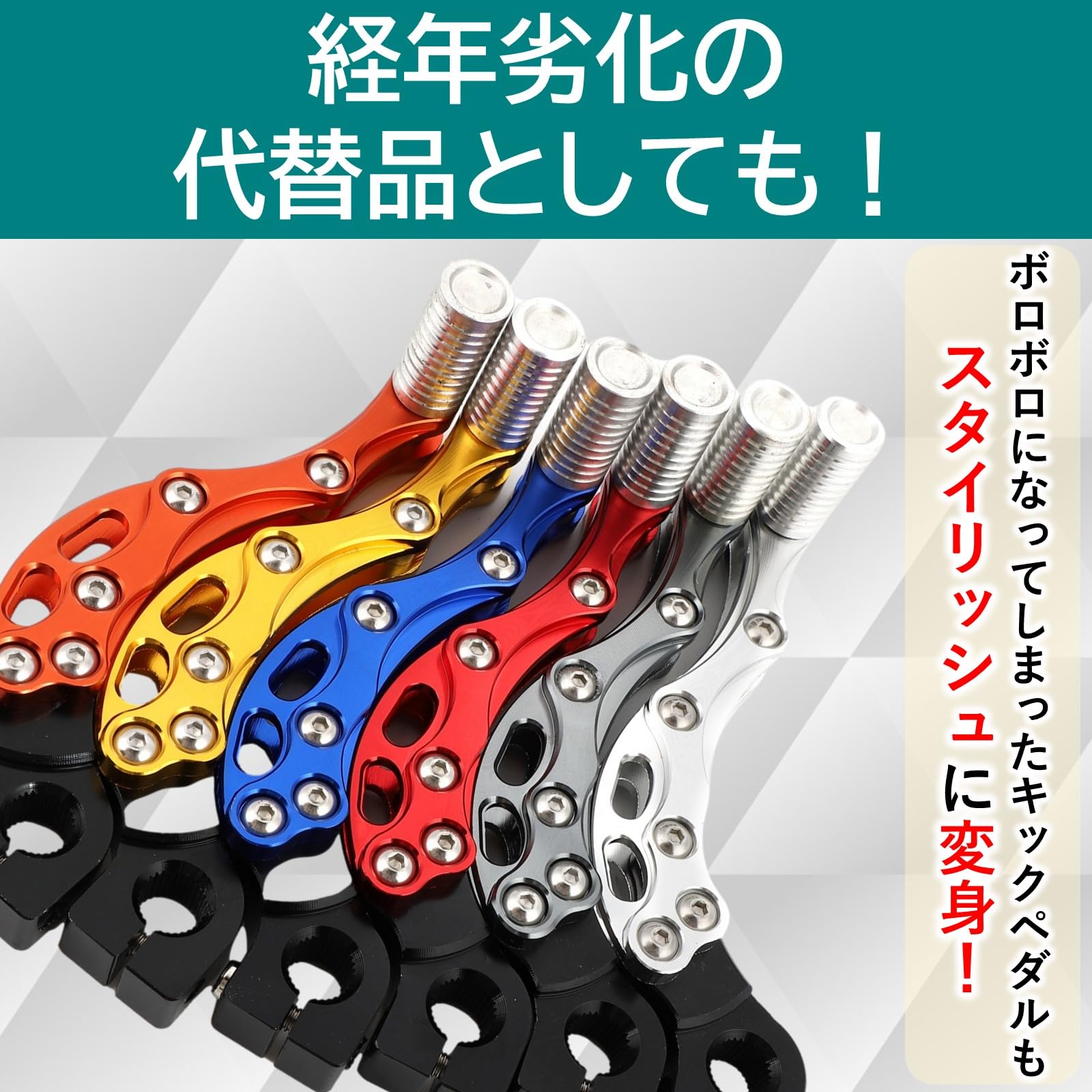 【キックペダル アルミ 汎用 ズーマー ジョーカー ドレスアップ スタイリッシュ】<br><br>・バイクのカスタムにおすすめの”キックペダル”。かっこよく愛車をカスタム、ドレスアップしたい方や、劣化や汚れ等の古くなったペダルを交換したい方にもおすすめです。<br>・機能性も抜群で踏み込みやすい構造になっており、楽にエンジン始動することができます。アルミ合金素材を使用しているため、強度があり丈夫です。<br>・汎用品なので、50ccやスクーター、ホンダ、スズキ、ヤマハ、カワサキ等の他、海外製の様々な車種のバイクに取付け可能です。ご購入の前に、ご自身のバイクの寸法をご確認ください。<br>・スタイリッシュでデザイン性があり、取り付けるだけで華やかになります。6色から選ぶことができるので愛車に合ったイメージチェンジを楽しめます。<br><br>(仕様)<br>サイズ(約): 本体全長17cm, キックペダル部分5.5cm, 取り付け部分2.7cm,ネジ0.5cm<br>素材:アルミ合金<br>重量(約):190g<br>カラー:ブルー、レッド、ゴールド、ブラック、シルバー、オレンジ<br>※モニターの環境により、色の見え方に若干差が生じる場合があります。