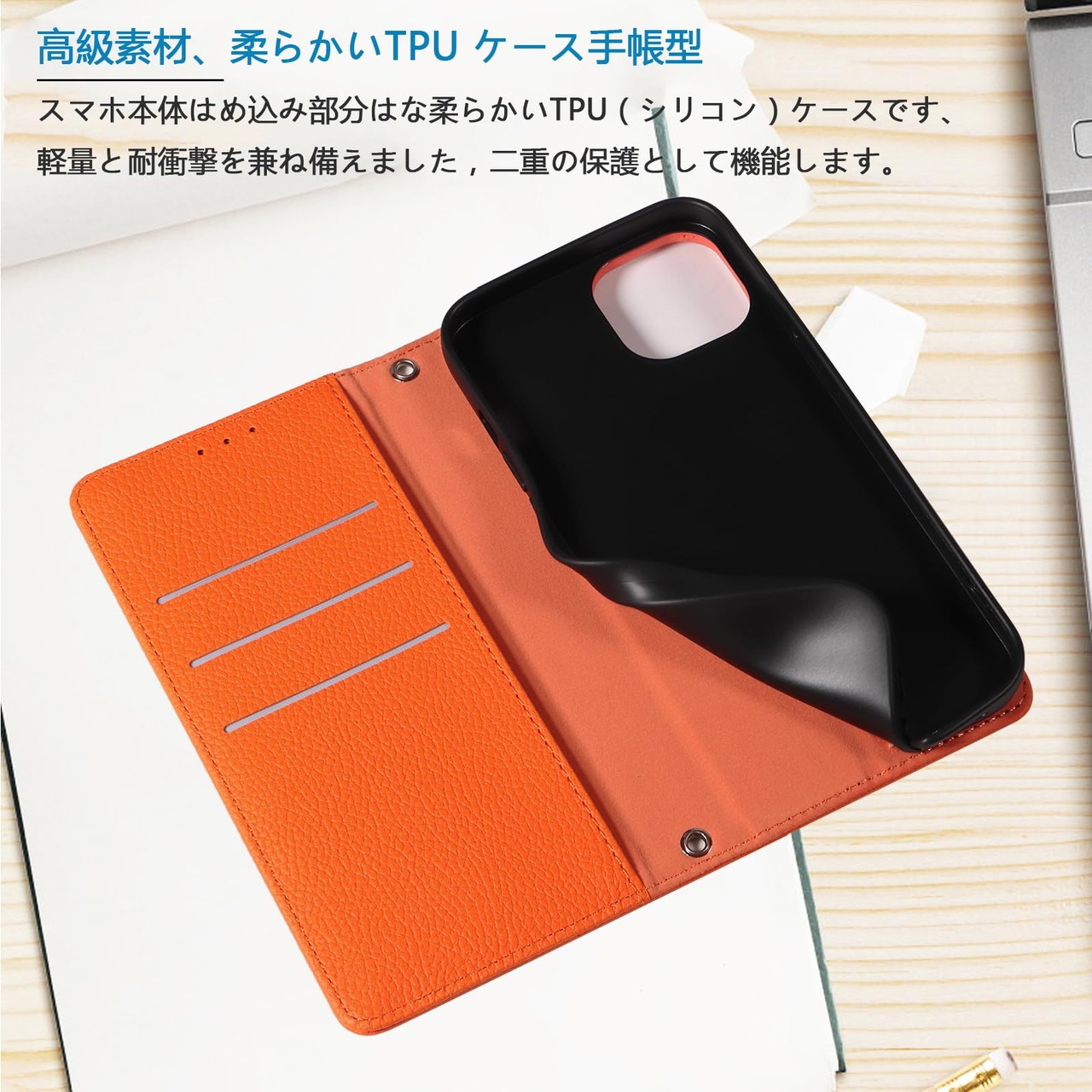 【カード収納】内側にはのカード入れとフリーポケットがつき、名刺や定期券の収納に優れているiPhone ケースです。普段の生活に便利をもたらします。