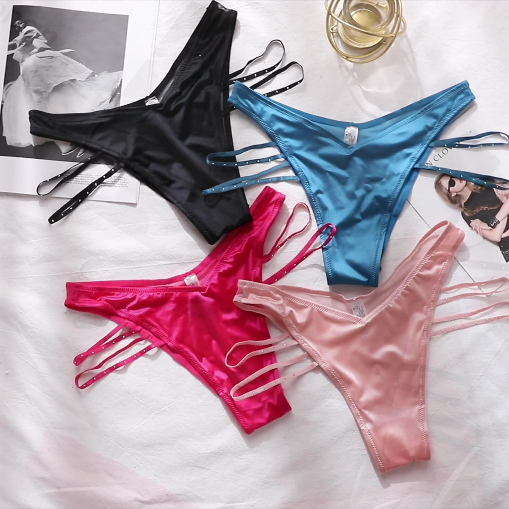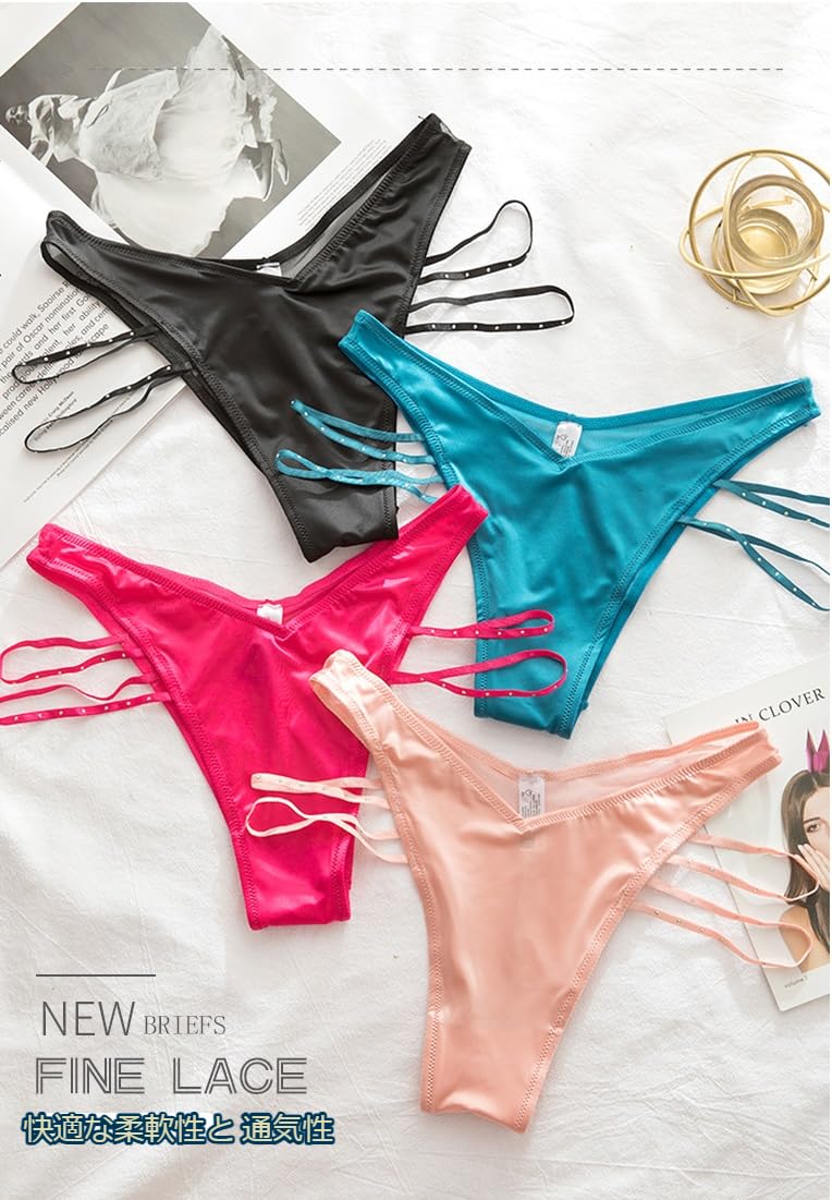 Mサイズ:体重約40kg~52kgの範囲を推奨します。<br> Lサイズ:体重約53kg~65kgの範囲を推奨します。<br> V字ラインのハーフカバーヒップで美尻を演出、薄手でスケスケでセクシーに魅せることが出来ます。伸縮性と通気性に優れ、クロッチはコットンです。セクシーなラインストーン入りのサイドストリング。<br> ブラック、レッド、ブルー、ピンクの4色セットでお得!その日の気分に合わせてチョイスできます!<br>