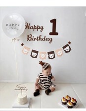 【セット内容物】happy birthdayフェルト生地バナー1点+数字フェルト生地バナー1点+フェルト生地可愛いクマガーランド1点+happy birthday三角帽子1点+happy birthdayバルーン4点+予備バルーン1点 付属品(リボン付き)