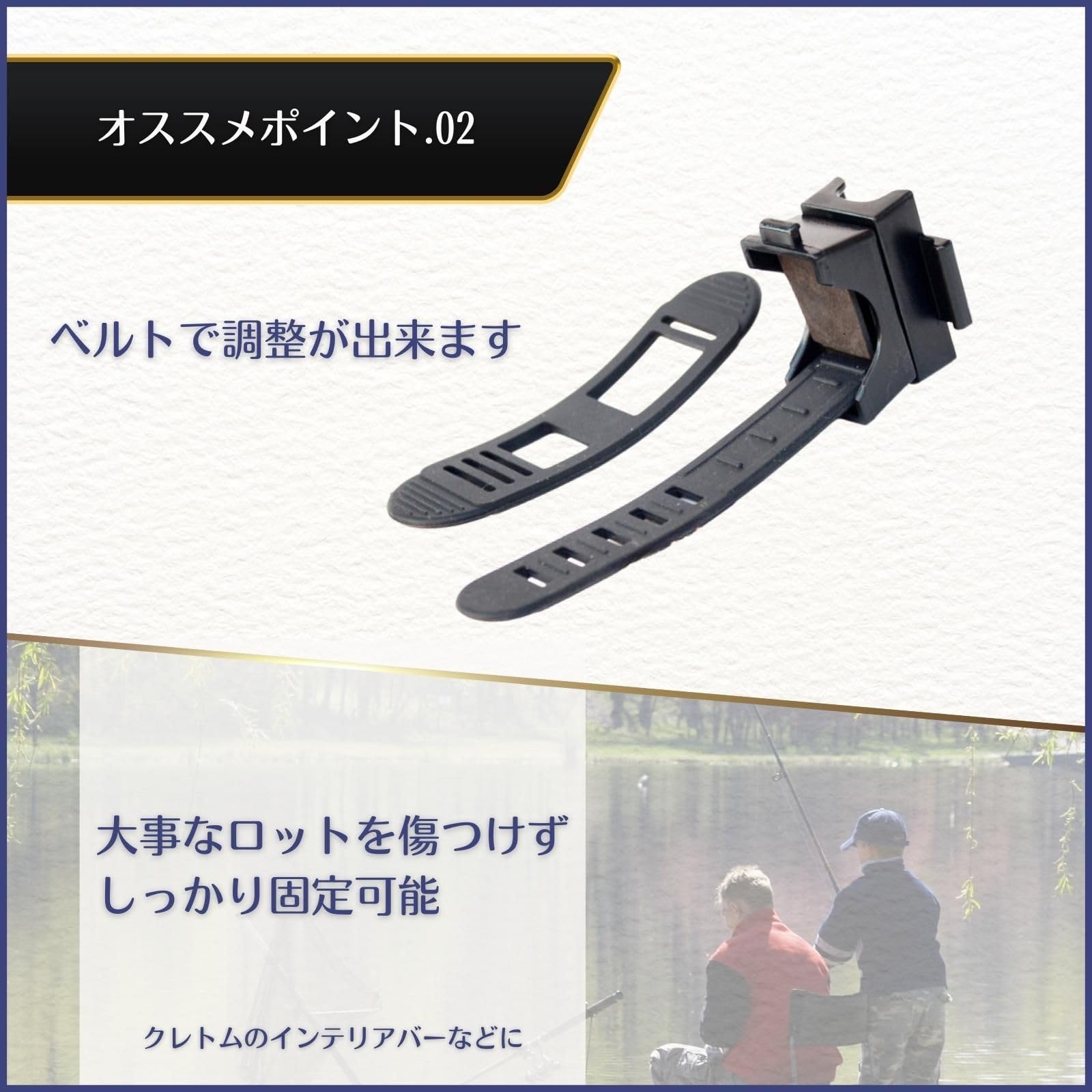 【ガッチリ固定】ベルトタイプのため、釣竿をしっかりと固定し、移動中のズレを防ぎます。これで、釣竿がしっかりと固定され、安心して運転できます。