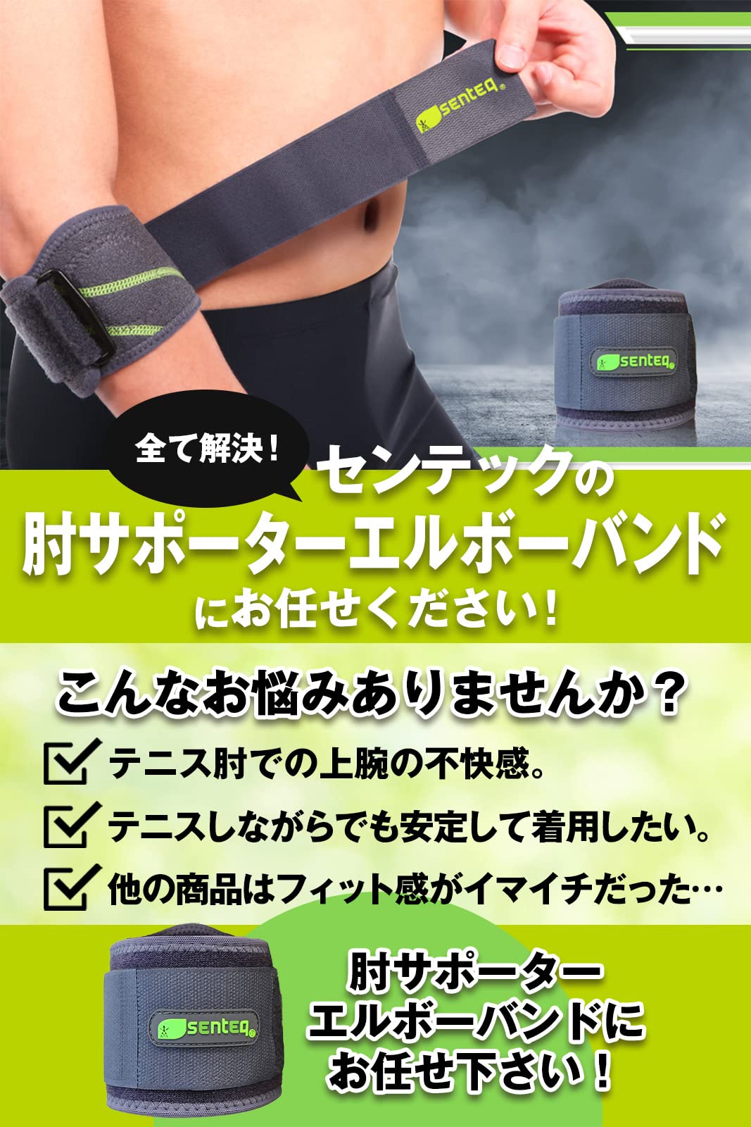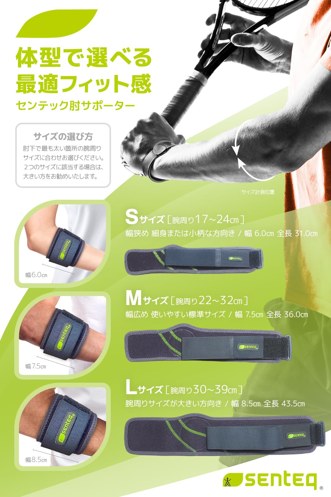 ◎センテック肘サポーターの5つの特徴◎ 1.パッドサポート力 2.フィット感の微調整が可能 3.ズレにくさ 4.肌トラブルを起こしにくい素材 5.不快な臭いがしない素材を厳選