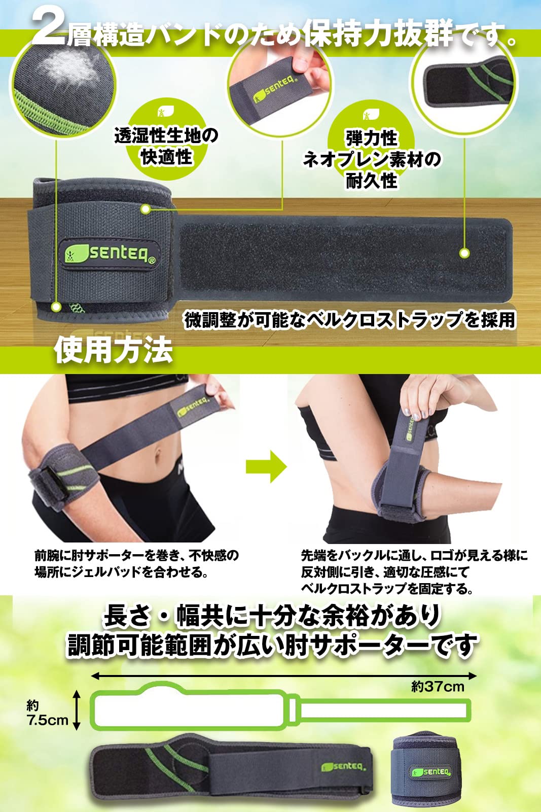 【■2層構造・ジェルパッド】スポーツで酷使の肘の不快感がある位置にジェルパッド部分を合わせて、サポーターを巻きます。ジェルパッドはサポート力があり、ほどよい圧がかかります。全体で約37cmの長さがあるため二重巻きができ、巻くだけで強い2層構造のバンドになります。また長いベルクロストラップで、腕のサイズに合わせた微調整が可能です。